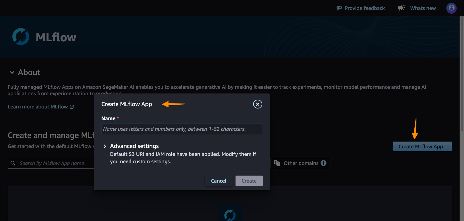 I choose Create MLflow App, and enter a name. Here, I have both an AWS Identity and Access Management (IAM) role and Amazon Simple Service (Amazon S3) bucket are already been configured. I only need to modify them in Advanced settings if needed.