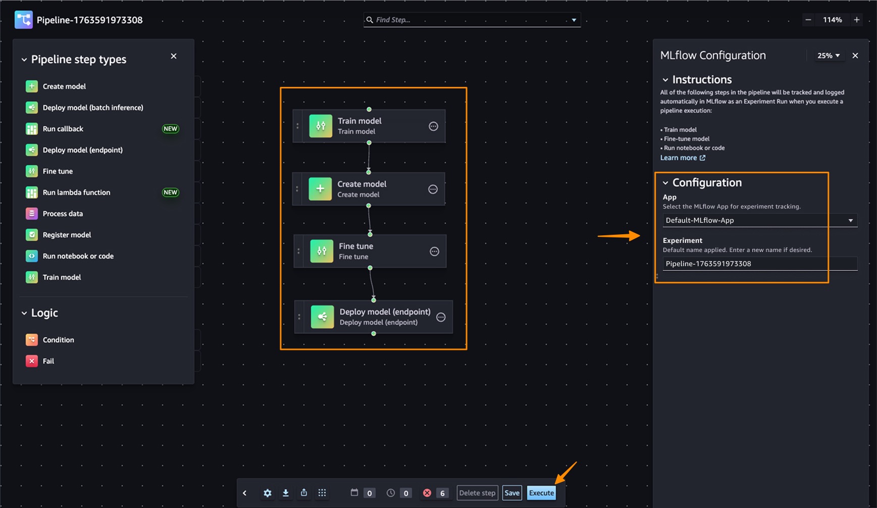 Amazon SageMaker Pipelines is integrated with MLflow. SageMaker Pipelines is a serverless workflow orchestration service purpose-built for machine learning operations (MLOps) and large language model operations (LLMOps) automation—the practices of deploying, monitoring, and managing ML and LLM models in production. You can easily build, execute, and monitor repeatable end-to-end AI workflows with an intuitive drag-and-drop UI or the Python SDK.