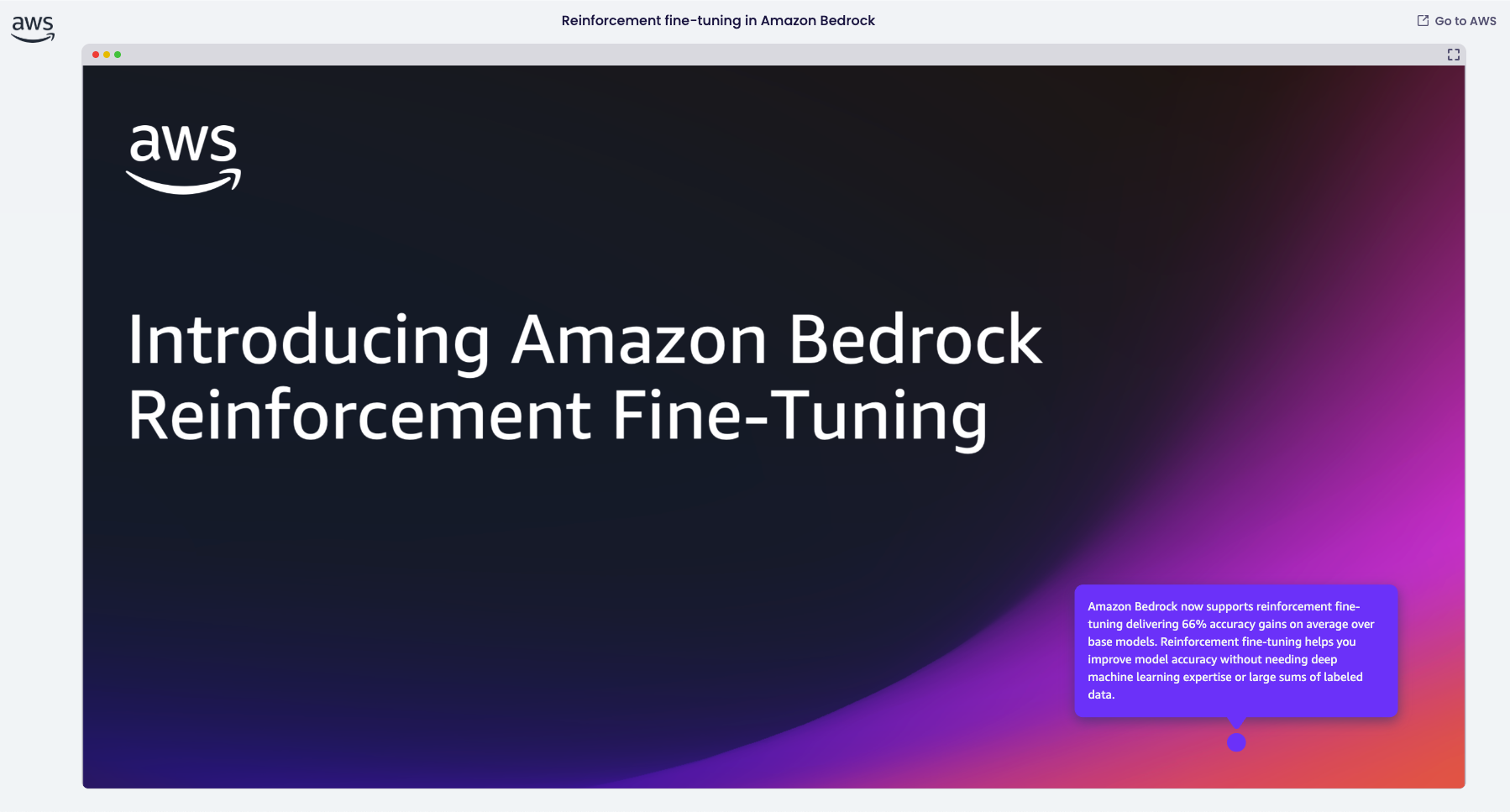 Today, we’re announcing reinforcement fine-tuning in Amazon Bedrock, a new model customization capability that creates smarter, more cost-effective models that learn from feedback and deliver higher-quality outputs for specific business needs. Reinforcement fine-tuning uses a feedback-driven approach where models improve iteratively based on reward signals, delivering 66% accuracy gains on average over base models.