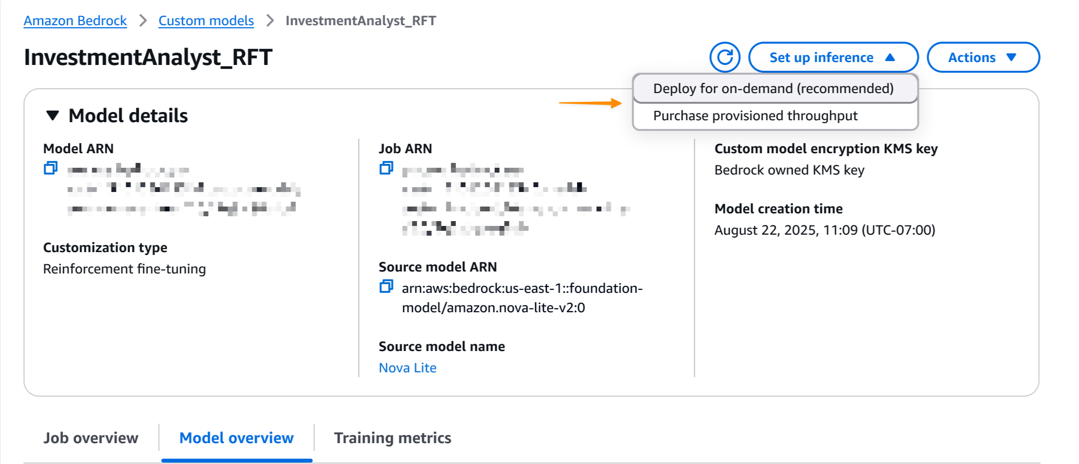 When the reinforcement fine-tuning job is completed, I can see the final job status on the Model details page.