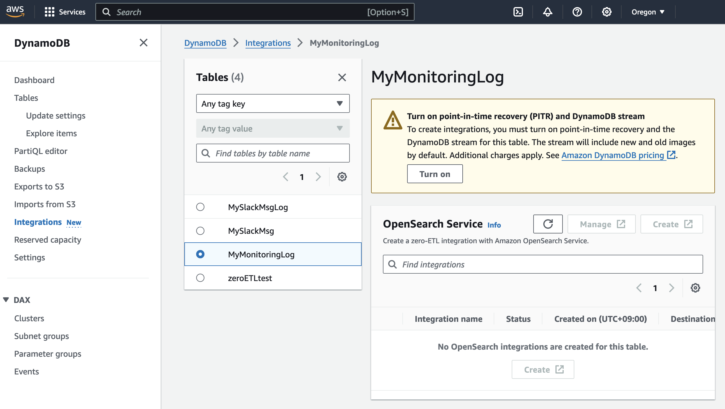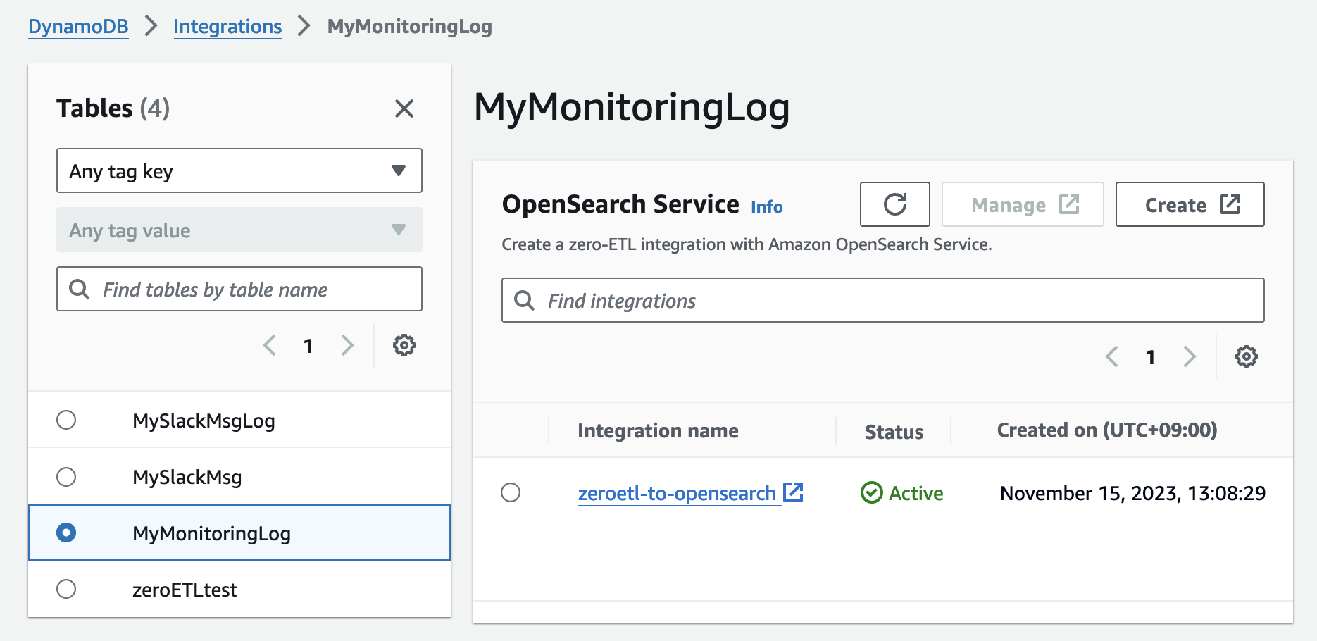 With a few clicks, you can synchronize data from DynamoDB to OpenSearch Service. To create an integration between DynamoDB and OpenSearch Service, choose the Integrations menu in the left pane of the DynamoDB console and the DynamoDB table whose data you want to synchronize.
