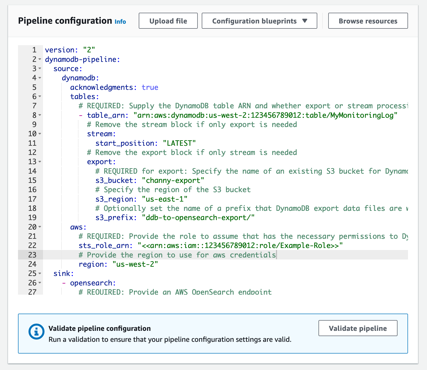 Now you can configure the pre-defined pipeline configuration in YAML file format. You can browse resources to look up and paste information to build the pipeline configuration. This pipeline is a combination of a source part from DyanmoDB settings and a sink part for OpenSearch Service.