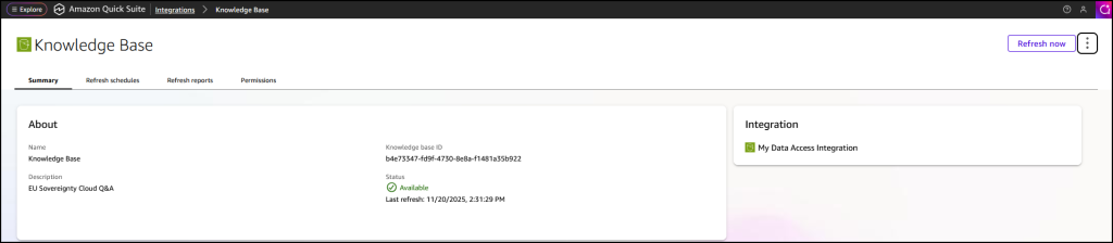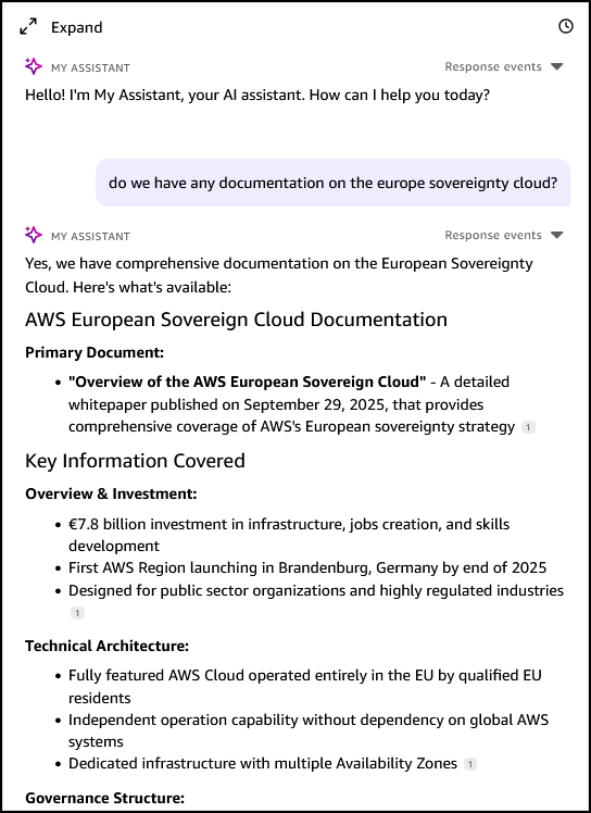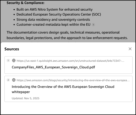 I want to learn more about the AWS European Sovereign Cloud so I’ve updated the file system (accessed through the S3 Access Point my-s3-accesspoin-iyytkgz83djdjj7abn3u711supfgkuse1b-ext-s3alias) with the AWS whitepaper on this topic. In the chat in Amazon Quick Suite. I start asking the first question “do we have any documentation on the europe sovereignty cloud?“. To answer my question, the chat agent accesses and analyzes various types of data sources I have permission to use, including uploaded files in my current conversation, spaces I have access to, knowledge bases from my integrations, and more.
