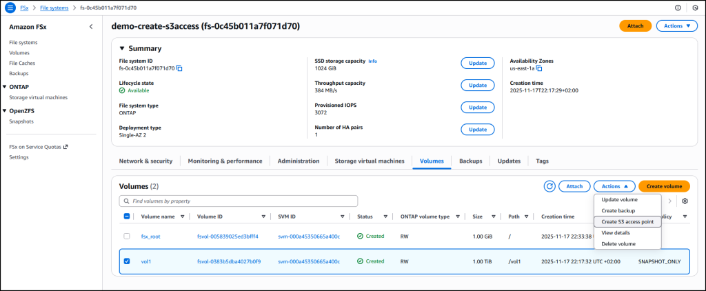 I’ll attach the access point to the volume of the file system. I choose the volume vol1 and then select Create S3 Access Point from the Actions dropdown menu.