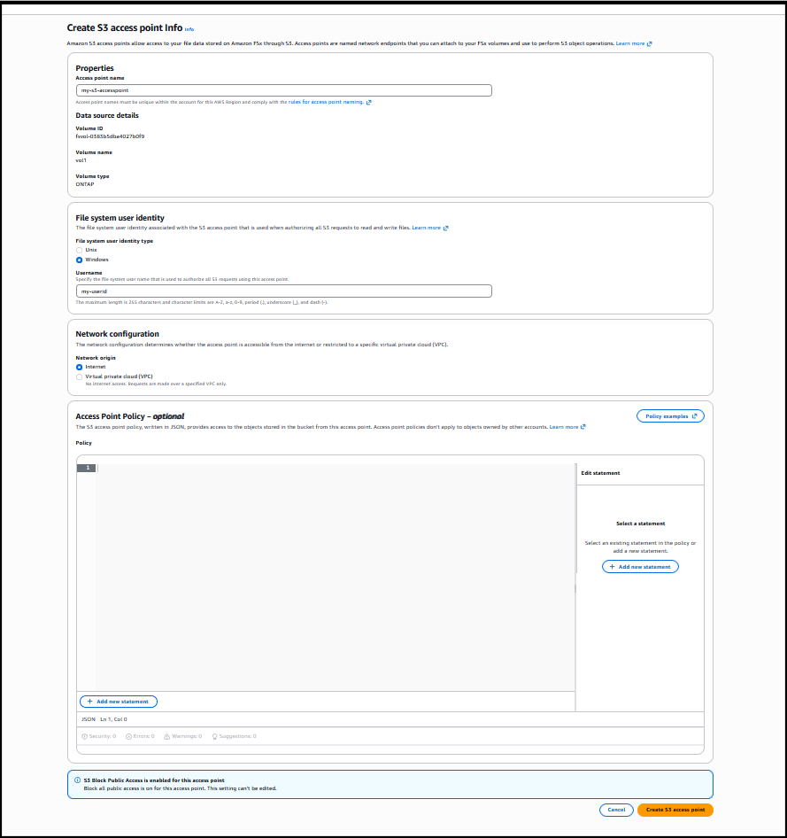 I enter details such as the access point name, the type of file system user identity and the network configuration, then choose Create s3 Access Point to finalize the process.