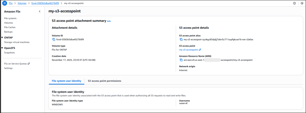 After it’s created, the access point my-s3-accesspoint is ready to allow access to the file data stored in my file system demo-create-s3access from Amazon S3. Amazon Access Points are S3 endpoints that can be attached to Amazon FSx volumes and used to perform Amazon S3 object operations.