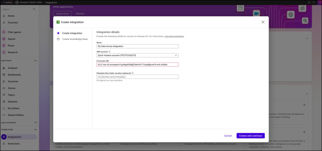 After I’ve selected the Amazon S3 integration I enter my Amazon S3 Access Point alias as the S3 bucket URL, leave the rest of the information as default, then choose Create and continue.