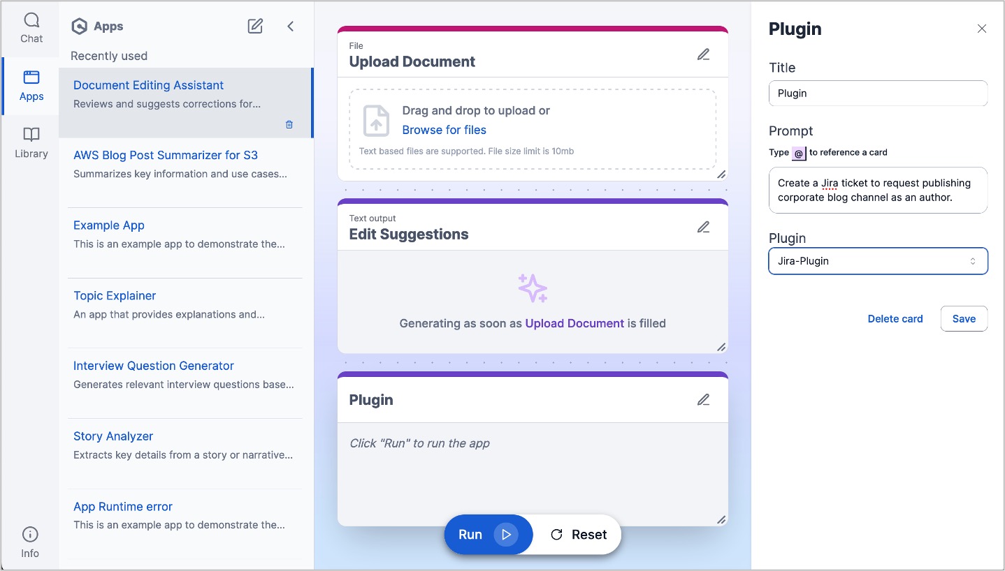 When you choose the Add card button, you can add more cards, such as a user input, text output, file upload, or pre-configured plugin by your administrator. If you want to create a Jira ticket to request publishing a post in the corporate blog channel as an author, you can add a Jira Plugin with the result of edited suggestions from the uploaded file.