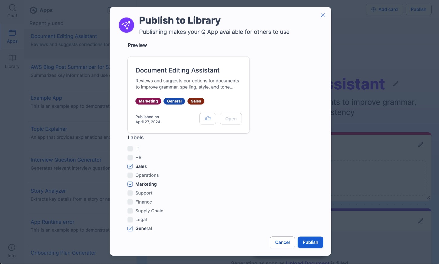Choose Library to see all of the published Amazon Q Apps. You can search the catalog by labels and open your favorite apps.