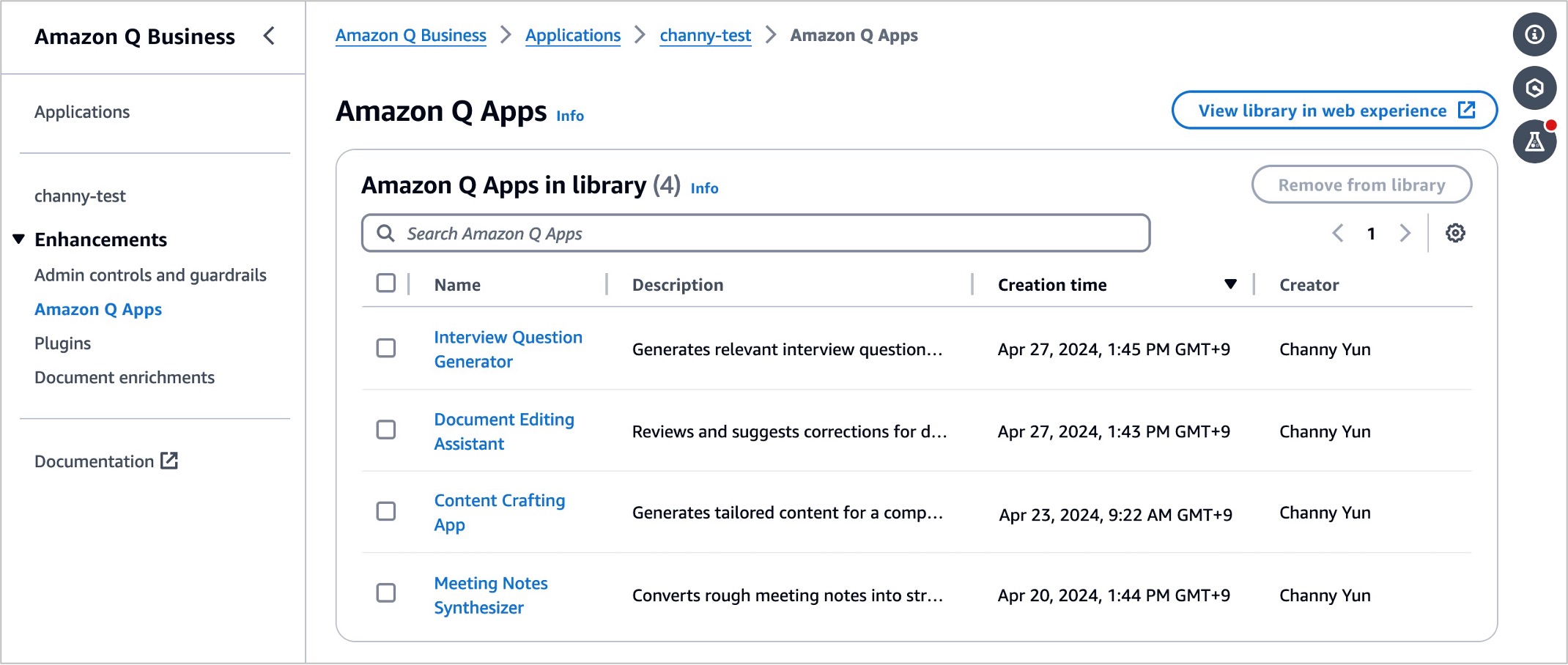 In the administrator console, you can see your Amazon Q Apps and control or remove them from the library.
