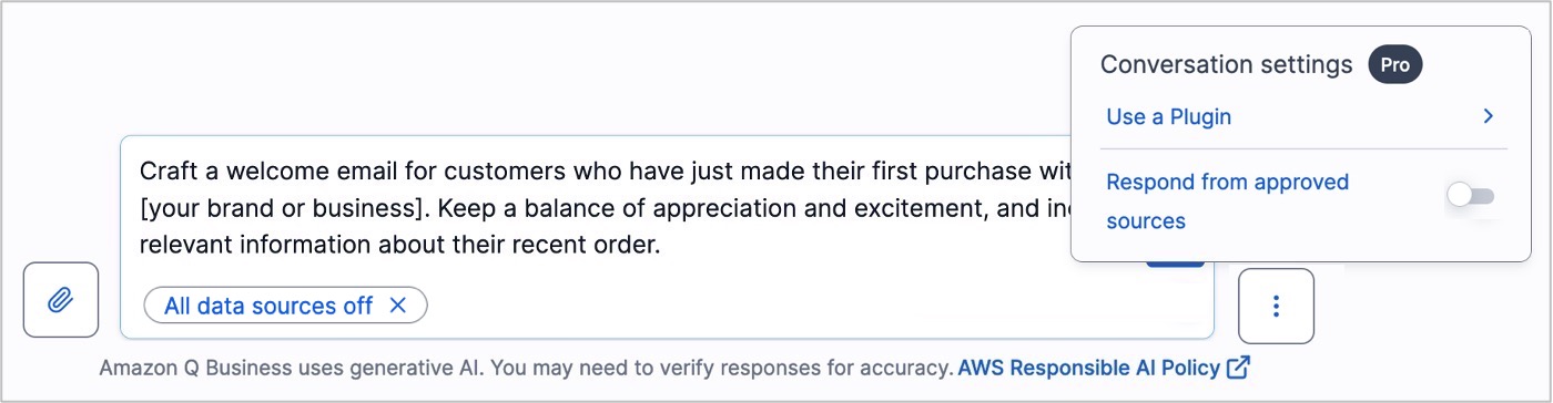 With general availability, we’re introducing a new content creation mode in the web experience. In this mode, Amazon Q Business does not use or access the enterprise content but instead uses generative AI models built into Amazon Q Business for creative use cases such as summarization of responses and crafting personalized emails. To use the content creation mode, you can turn off Respond from approved sources in the conversation settings.