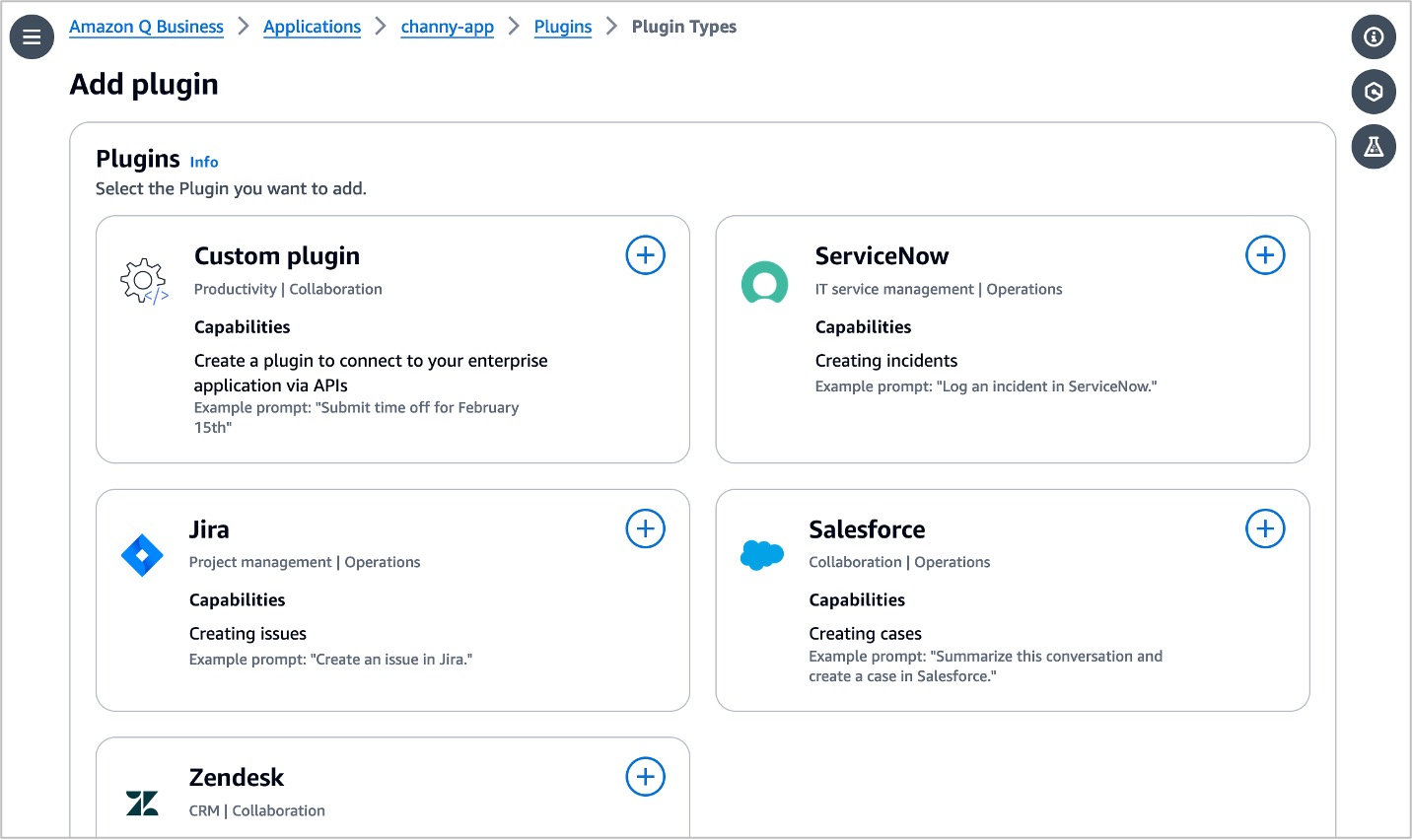 You can configure plugins to perform actions in enterprise systems, including Jira, Salesforce, ServiceNow, and Zendesk. Users can create a Jira issue or a Salesforce case while chatting in the chat assistant. You can also deploy a Microsoft Teams gateway or a Slack gateway to use an Amazon Q Business assistant in your teams or channels.