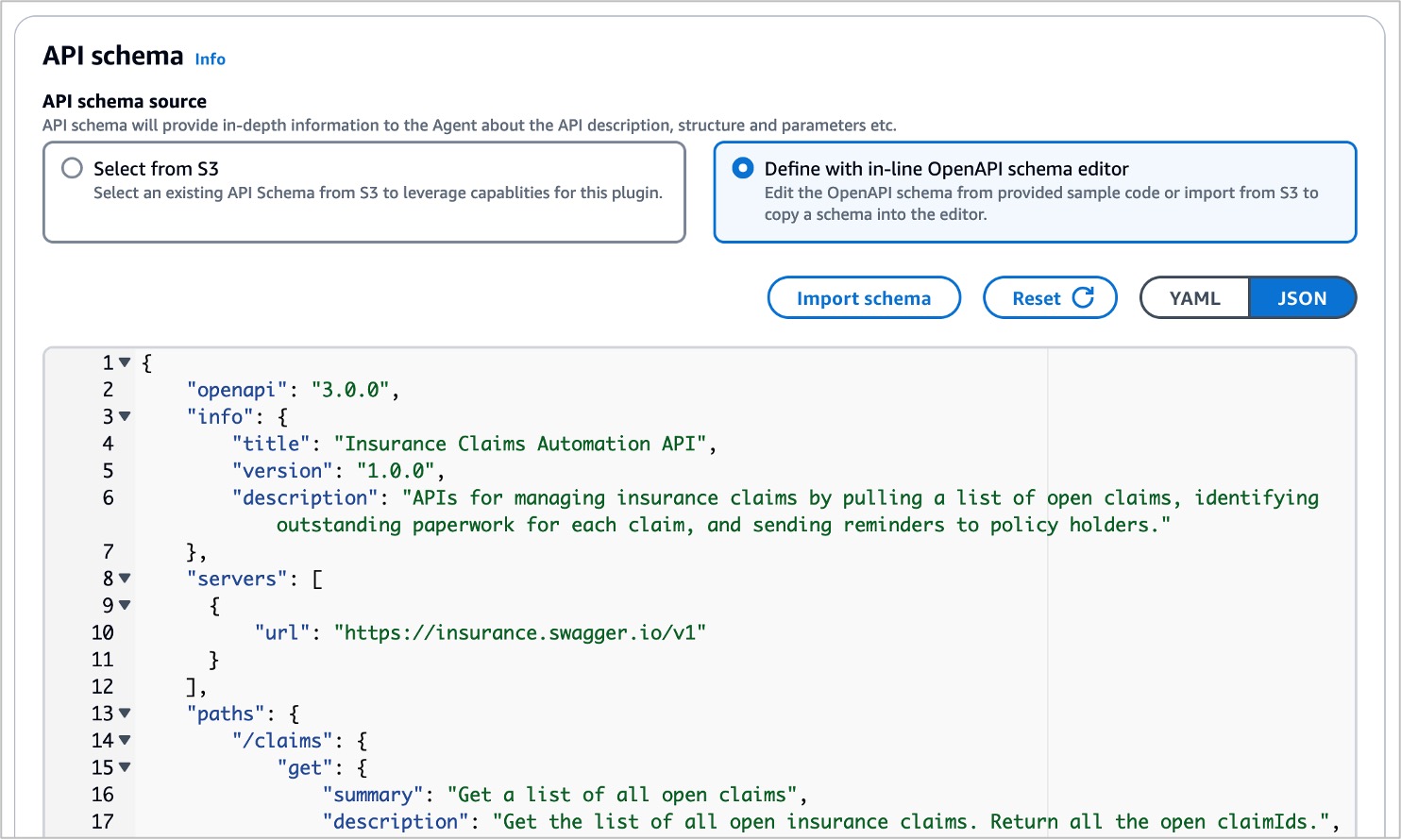 When you choose Custom plugin, you can define an OpenAPI schema to connect your third-party application. You can upload the OpenAPI schema to Amazon S3 or copy it to the Amazon Q Business console in-line schema editor compatible with the Swagger OpenAPI specification.