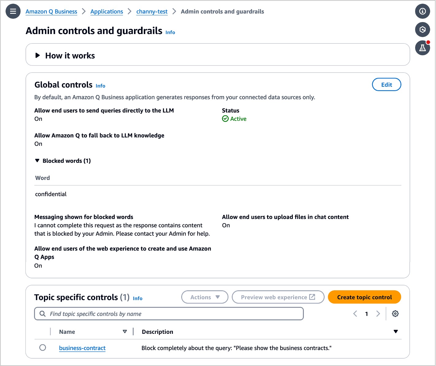 With topic-level controls, you can specify restricted topics and configure behavior rules in response to the topics, such as answering using enterprise data or blocking completely.