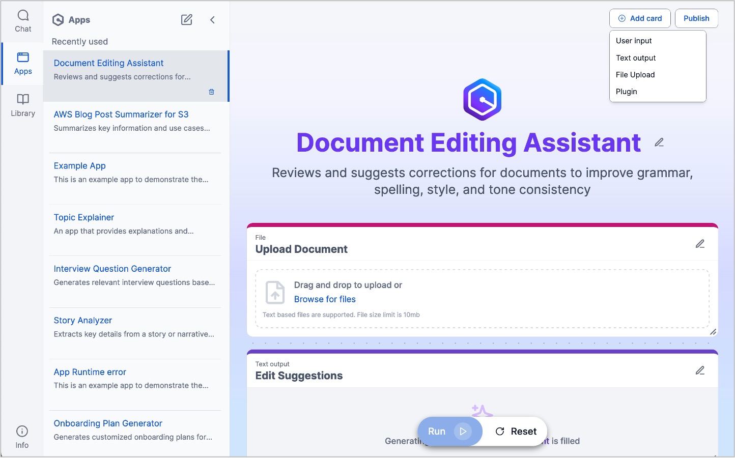 When you choose the Generate button, a document editing assistant app will be automatically generated with two cards—one to upload a document file as an input and another text output card that gives edit suggestions.