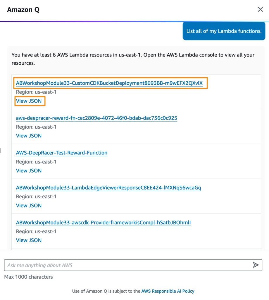 With this capability, I can ask Amazon Q Developer to list all of my AWS resources. For example, if I ask Amazon Q Developer, “List all of my Lambda functions,” Amazon Q Developer returns the response with a set of my AWS Lambda functions as requested, as well as deep links so I can navigate to each resource easily.