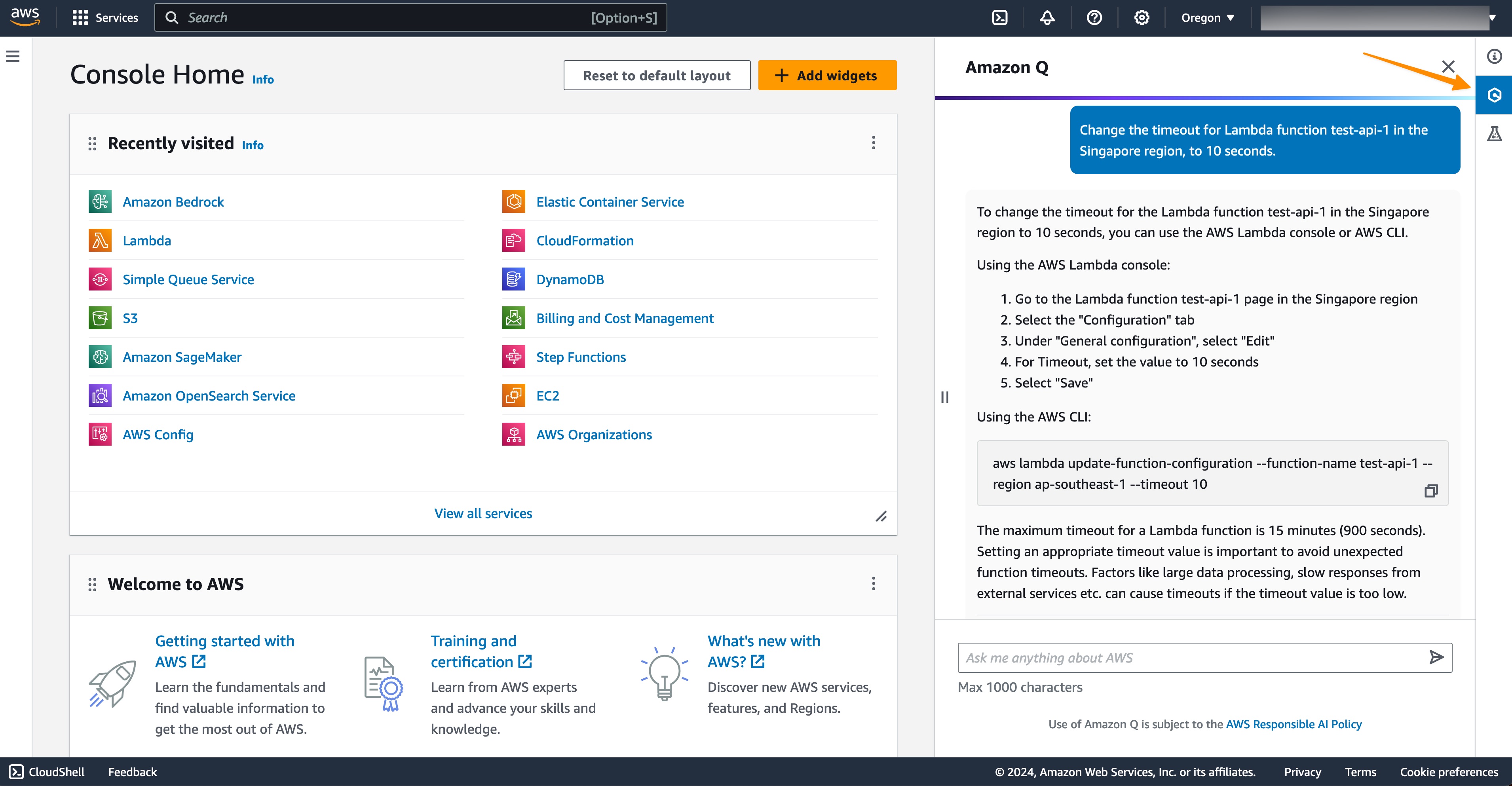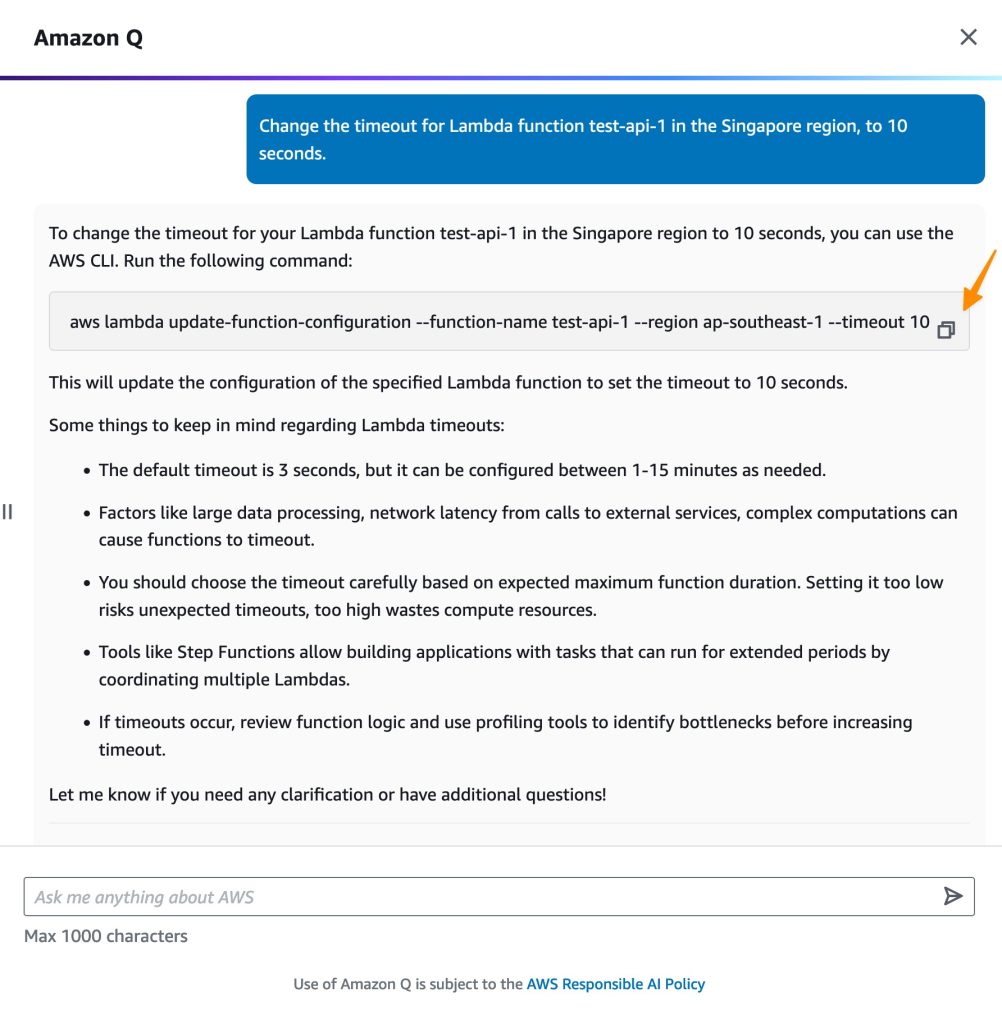 Not only that, this capability can also generate AWS Command Line Interface (AWS CLI) commands so I can make changes immediately. Here, I ask Amazon Q Developer to change the timeout configuration for my Lambda function.