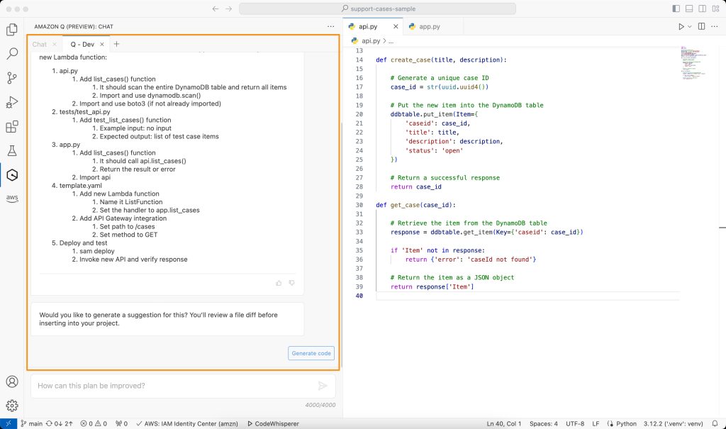 With the Amazon Q Developer Agent for software development, Amazon Q Developer can help you develop code features for projects in your IDE. To get started, you enter /dev in the Amazon Q Developer chat panel. My colleague Séb shared with me the following screenshot when he was using this capability for his support case project. He used the following prompt to generate an implementation plan for creating a new API in AWS Lambda:
