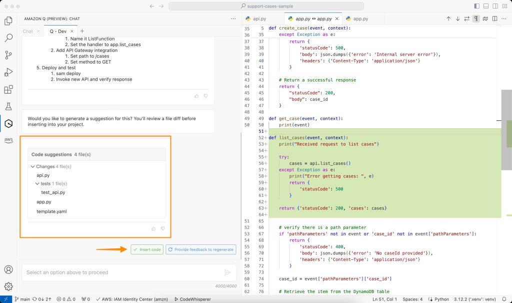 Amazon Q Developer then provides an initial plan and you can keep on iterating this plan until you’re sure mostly everything is covered. Then, you can accept the plan and select Insert code.