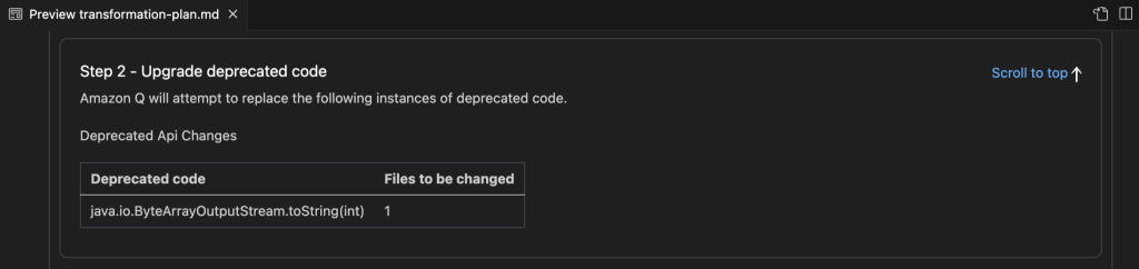 In this step, if Amazon Q identifies any deprecated code that Java language specifications recommend replacing, it will make those updates automatically during the upgrade. This is a new enhancement to Amazon Q capabilities and is available now.
