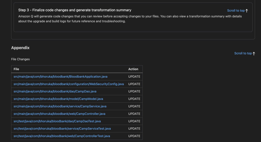 In the first step, Amazon Q identifies and provides details on the Java Development Kit (JDK) version, dependencies, and related code that needs to be updated. The dependencies upgrades now include upgrading popular frameworks to their latest major versions. For example, if you’re building with Spring Boot, it now gets upgraded to version 3 as part of the Java 17 upgrade.