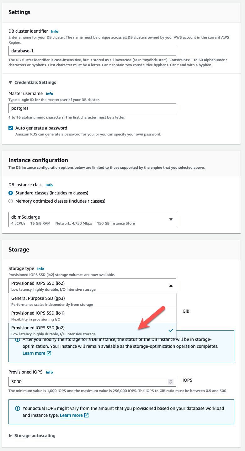 Start with the basic information such as engine and version. Then, choose Provisioned IOPS SDD (io2) from the Storage type options: