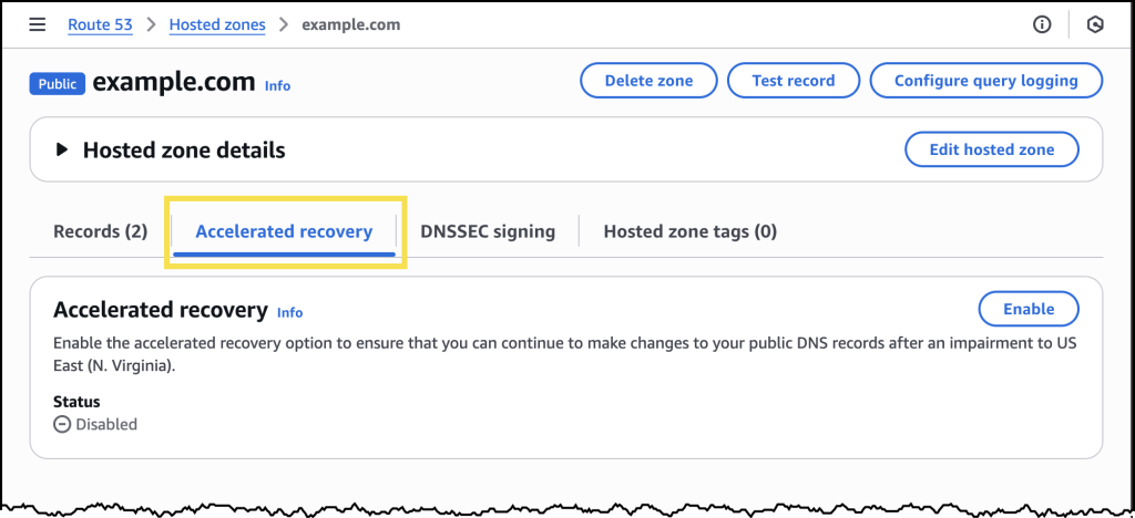 Once I have created my hosted zone, I see a new tab labeled Accelerated recovery. I can see here that accelerated recovery is disabled by default.