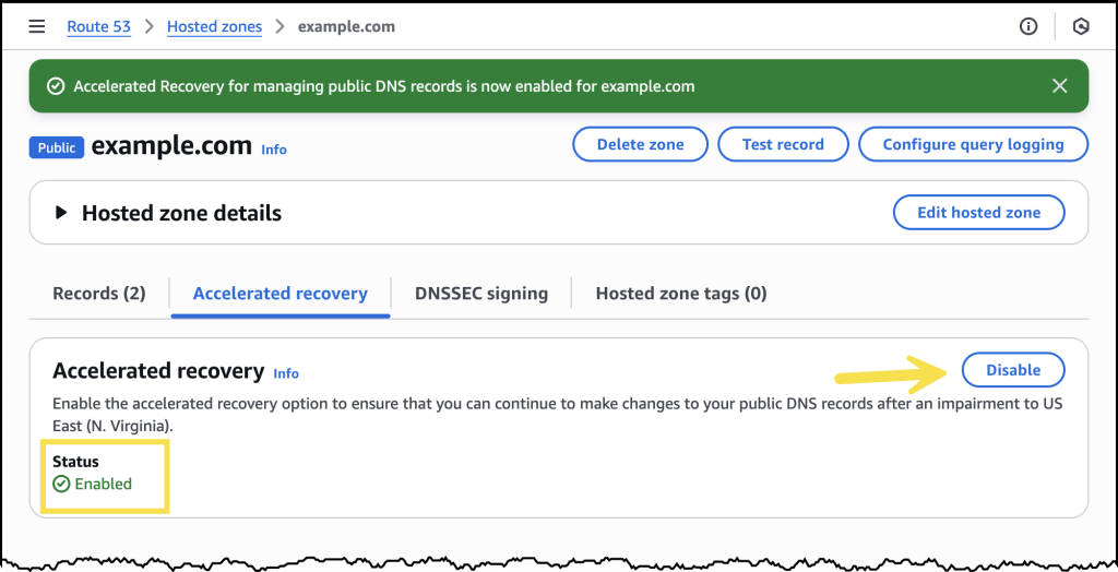 I can disable accelerated recovery at any time from this same area of the AWS Management Console. I can also enable accelerated recovery for any existing hosted zones I have already created.