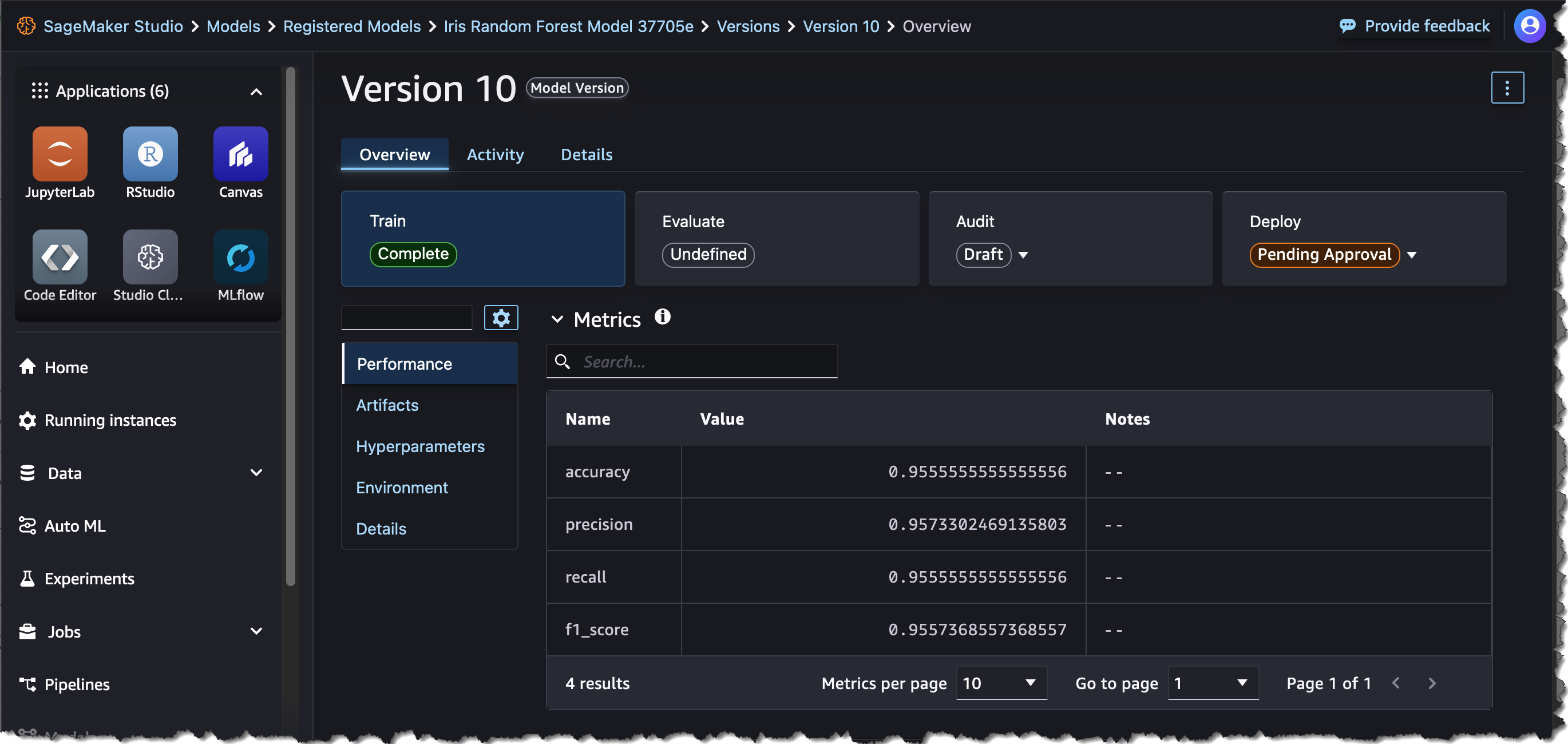 Once you’ve compared the multiple runs as detailed in Step 4, you can register the model whose metrics best meet your requirements in the MLflow Model Registry. Registering a model indicates potential suitability for production deployment and there will be further testing to validate this suitability. Once a model is registered in MLflow it automatically appears in the SageMaker Model Registry for a unified model governance experience so you can deploy MLflow models to SageMaker inference. This enables data scientists who primarily use MLflow for experimentation to hand off their models to ML engineers who govern and manage production deployments of models using the SageMaker Model Registry.