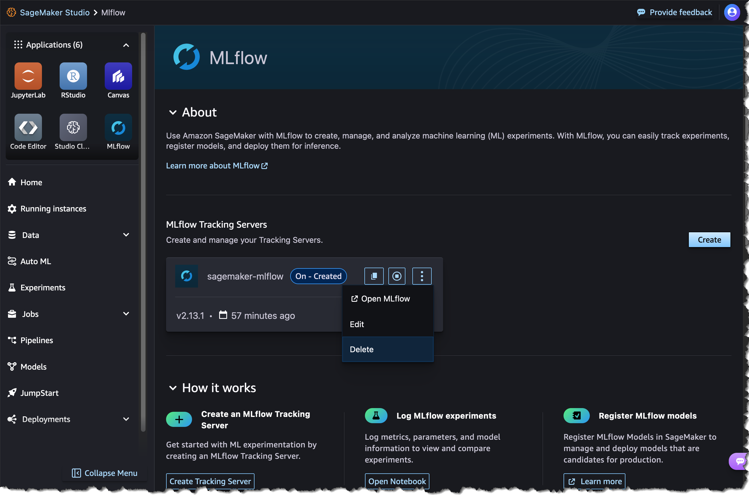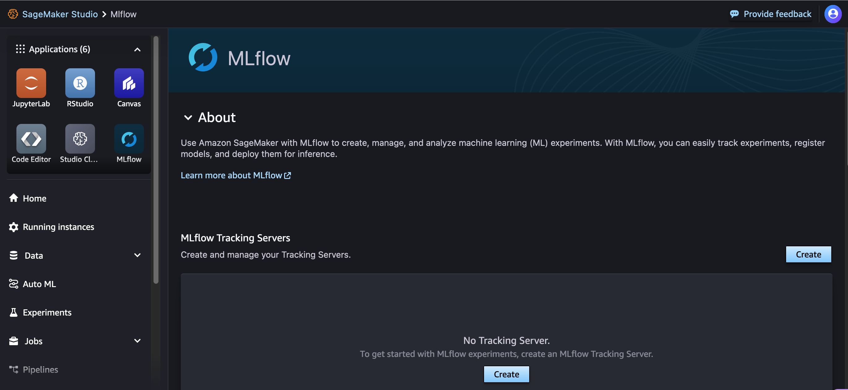 To get started, in your SageMaker Studio domain created during your environment set up detailed earlier, select MLflow under Applications and choose Create.
