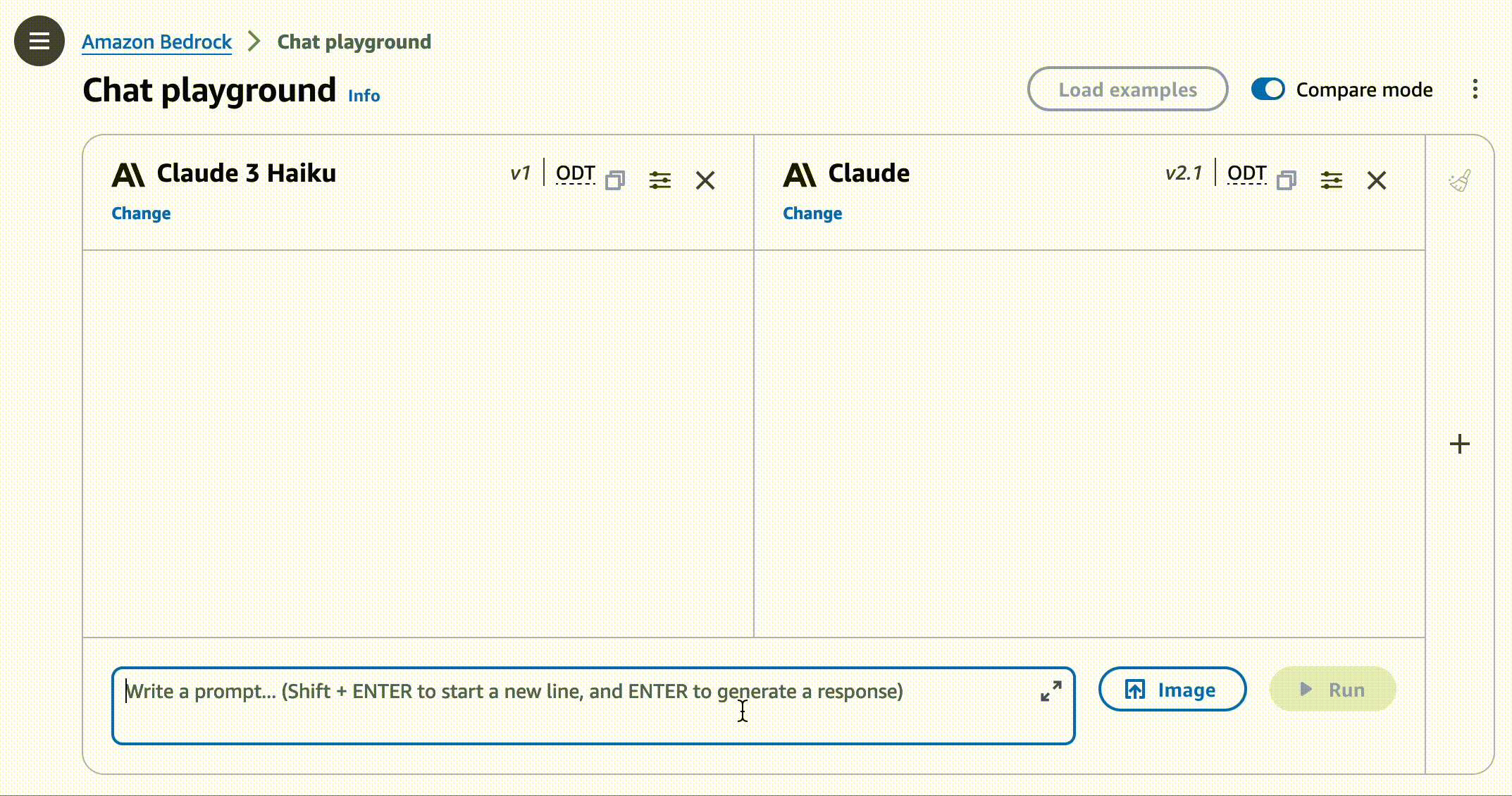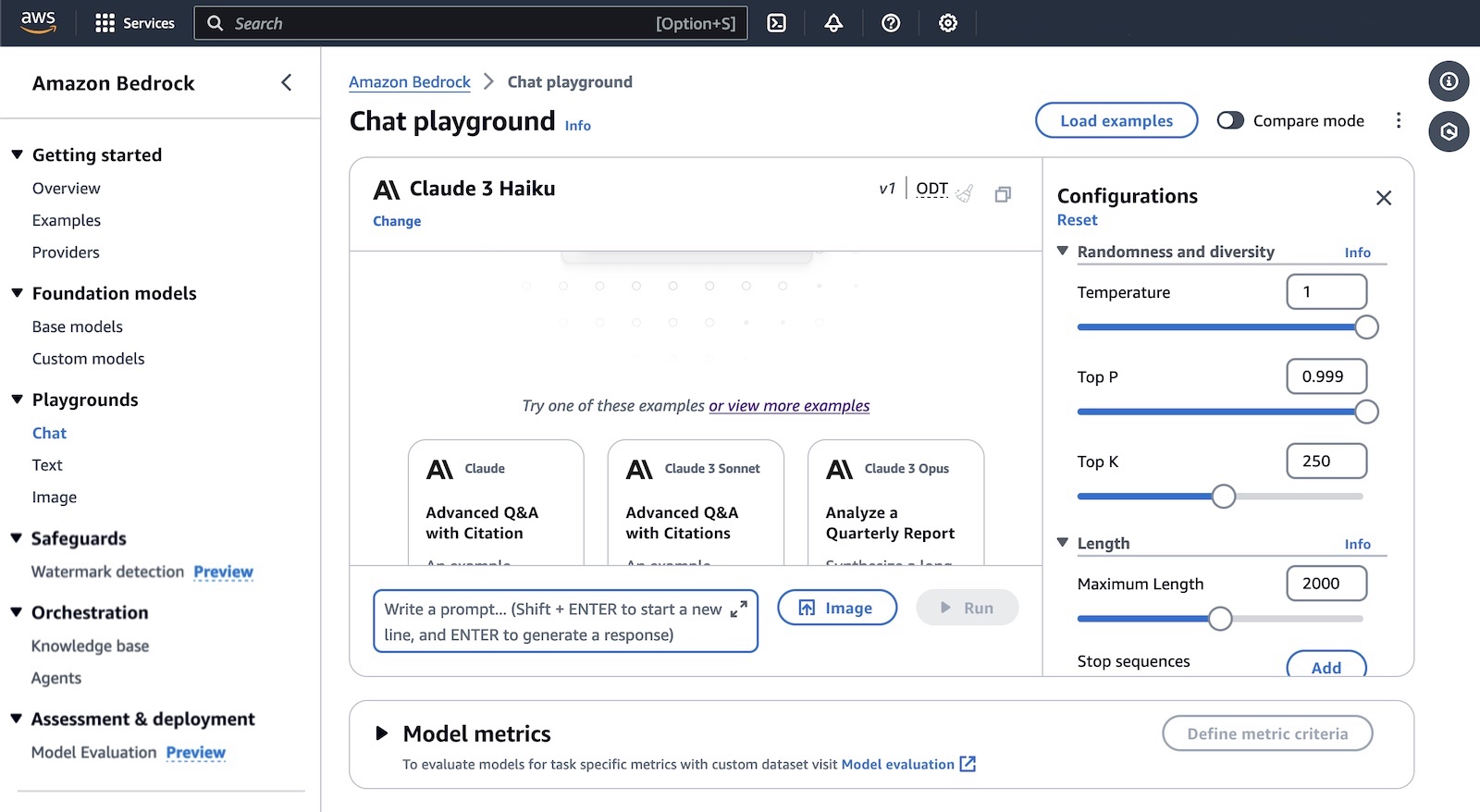 To test more Claude prompt examples, choose Load examples. You can view and run examples specific to Claude 3 Haiku, such as advanced Q&A with citations, crafting a design brief, and non-English content generation.