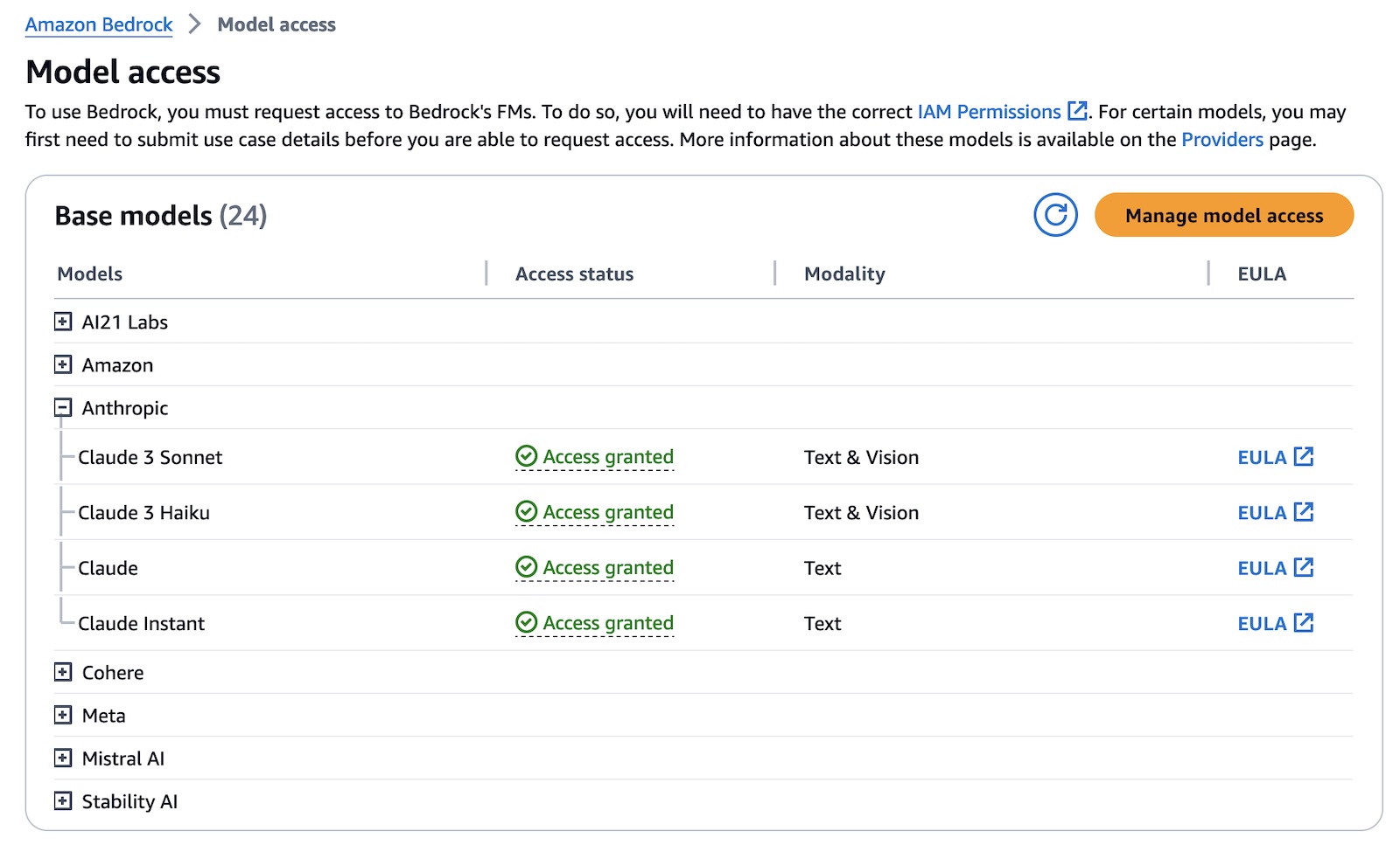 If you are new to using Anthropic models, go to the Amazon Bedrock console and choose Model access on the bottom left pane. Request access separately for Claude 3 Haiku.
