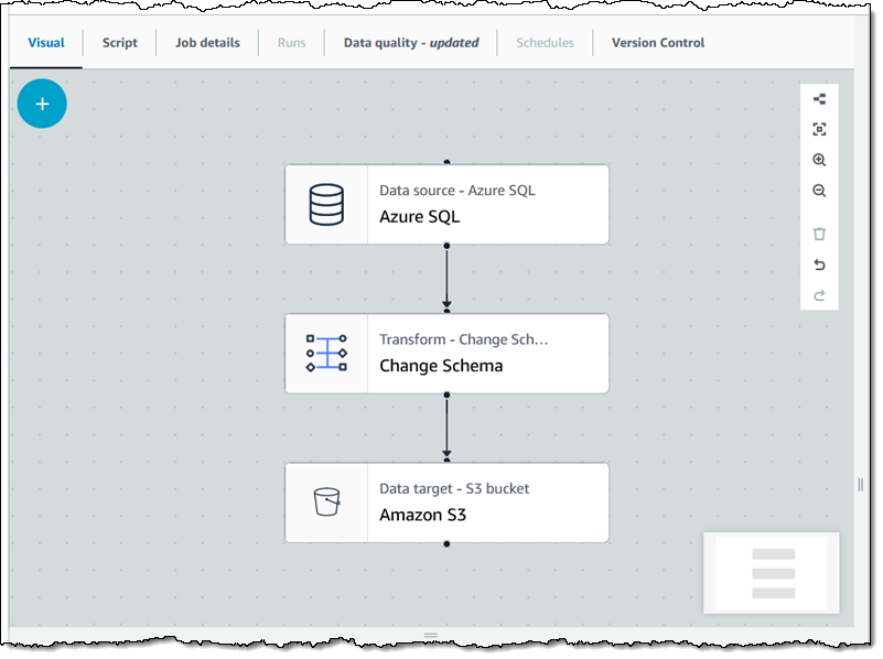 AWS Glue – This data integration service helps you to discover, prepare, and integrate all of your data at any scale. You can use it to connect to more than 80 different data sources, including cloud databases and analytics services. In October 2023, we introduced additional new connectors that allow you to move data bidirectionally between Amazon Simple Storage Service (Amazon S3), and either Azure Blob Storage or Azure Data Lake Storage (full list). We also launched six database connectors for AWS Glue for Apache Spark, including Teradata, SAP HANA, Azure SQL, Azure Cosmos DB, Vertica, and MongoDB (full list). To learn more about AWS Glue, read What is AWS Glue. I create a visual job flow to get started: