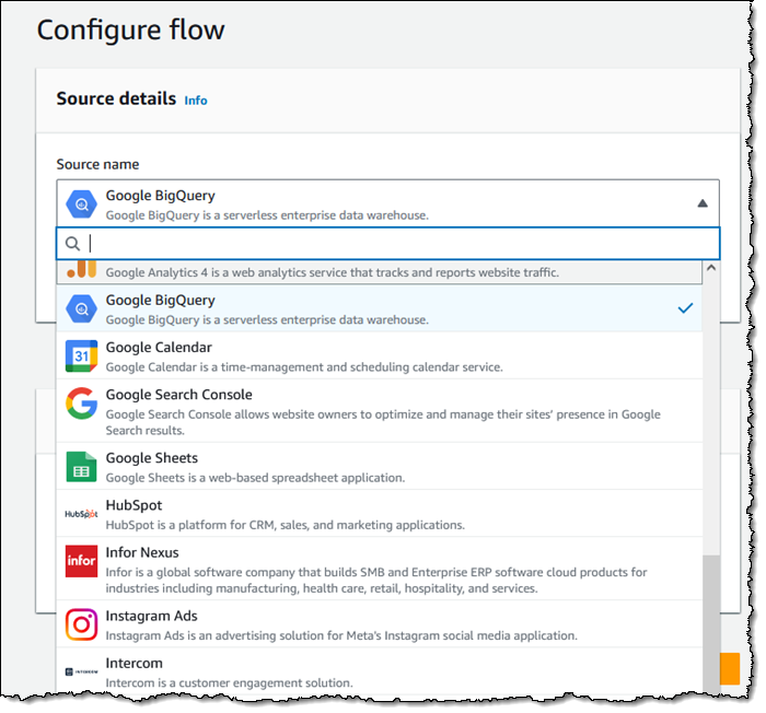 Amazon AppFlow – You can take advantage of data and analytics in Google BigQuery using a connector available in Amazon AppFlow. To get started with Amazon AppFlow I create a flow and configure a data source: