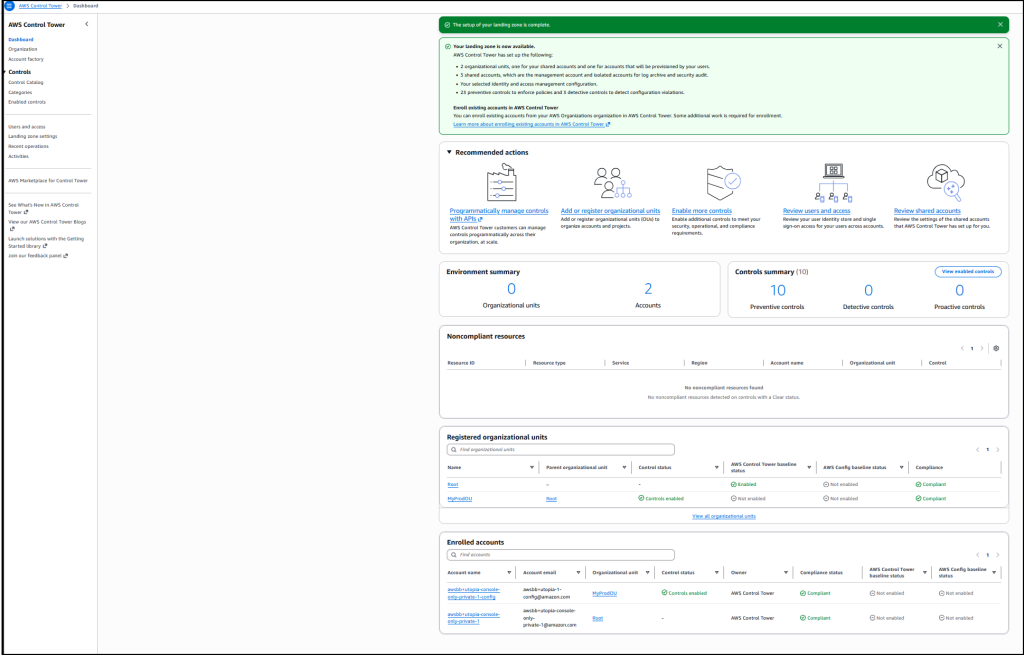 The dashboard gives a summary of the environment such as the organizational units that were created, the shared accounts, the selected IAM configuration, the preventive controls to enforce policies, and detective controls to detect configuration violations.