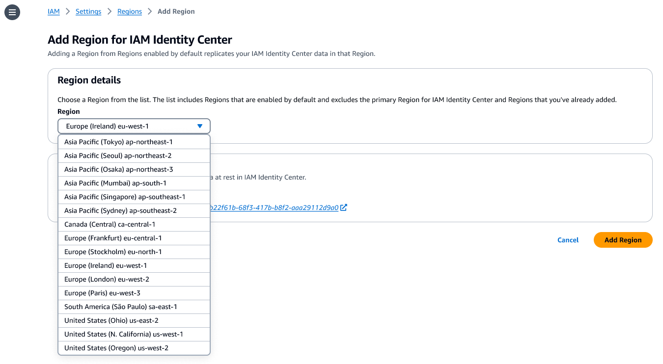 Choose Add Region. This starts the initial replication whose duration depends on the size of your Identity Center instance.