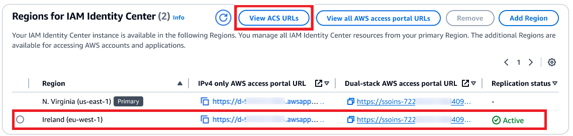After the replication is completed, your users can access their AWS accounts and applications in this new Region. When you choose View ACS URLs, you can view SAML information, such as an Assertion Consumer Service (ACS) URL, about the primary and additional Regions.