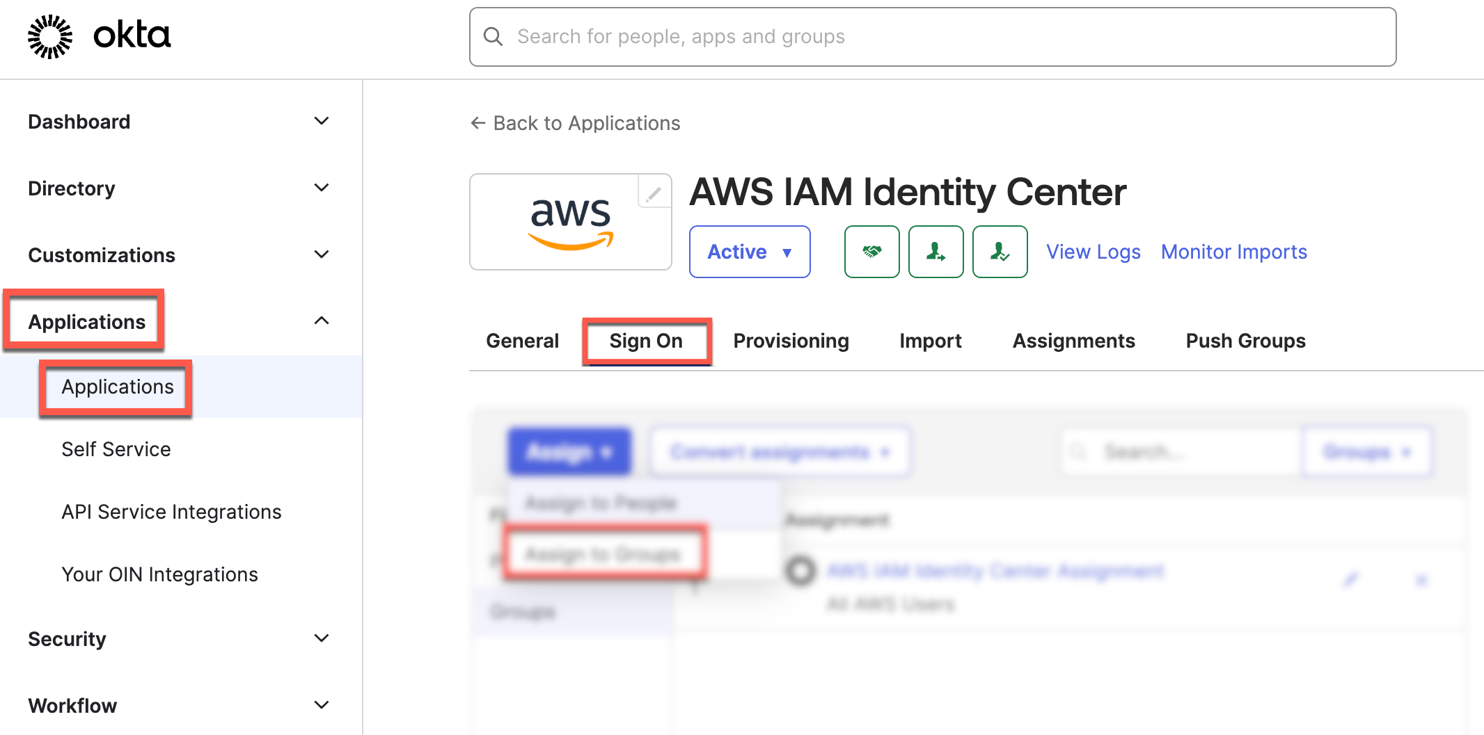 The following screenshots show you how to do this in the Okta admin console: