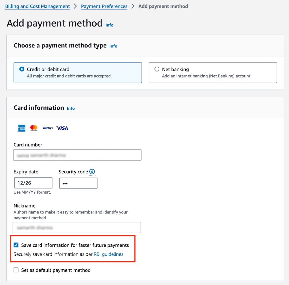 Previously, customers needed to manually enter their card information in the payments console for each payment. Now they can save their cards in their accounts by providing consent, according to RBI guidelines. Customers can save their cards when they sign up for AWS, through the payment console by adding a card in payment preferences, or while making a payment for an invoice.