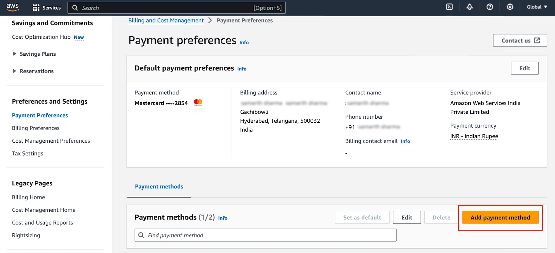 To get started, go to Payment preferences in the AWS Billing and Cost Management console. Choose Add Payment method to add debit or credit card payment.