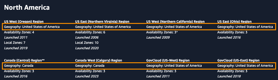 To find the geographic information for your Region, you can visit the AWS Global Infrastructure Regions and Availability Zones page. Once you navigate to this page, you can choose any tab on the map and scroll to the bottom to review the geographic information for each Region. See the following image for an example showing the North America Regions. As would be expected, the infrastructure for the US West (Oregon) Region is located in the United States of America, and the Canada (Central) Region is located in Canada.