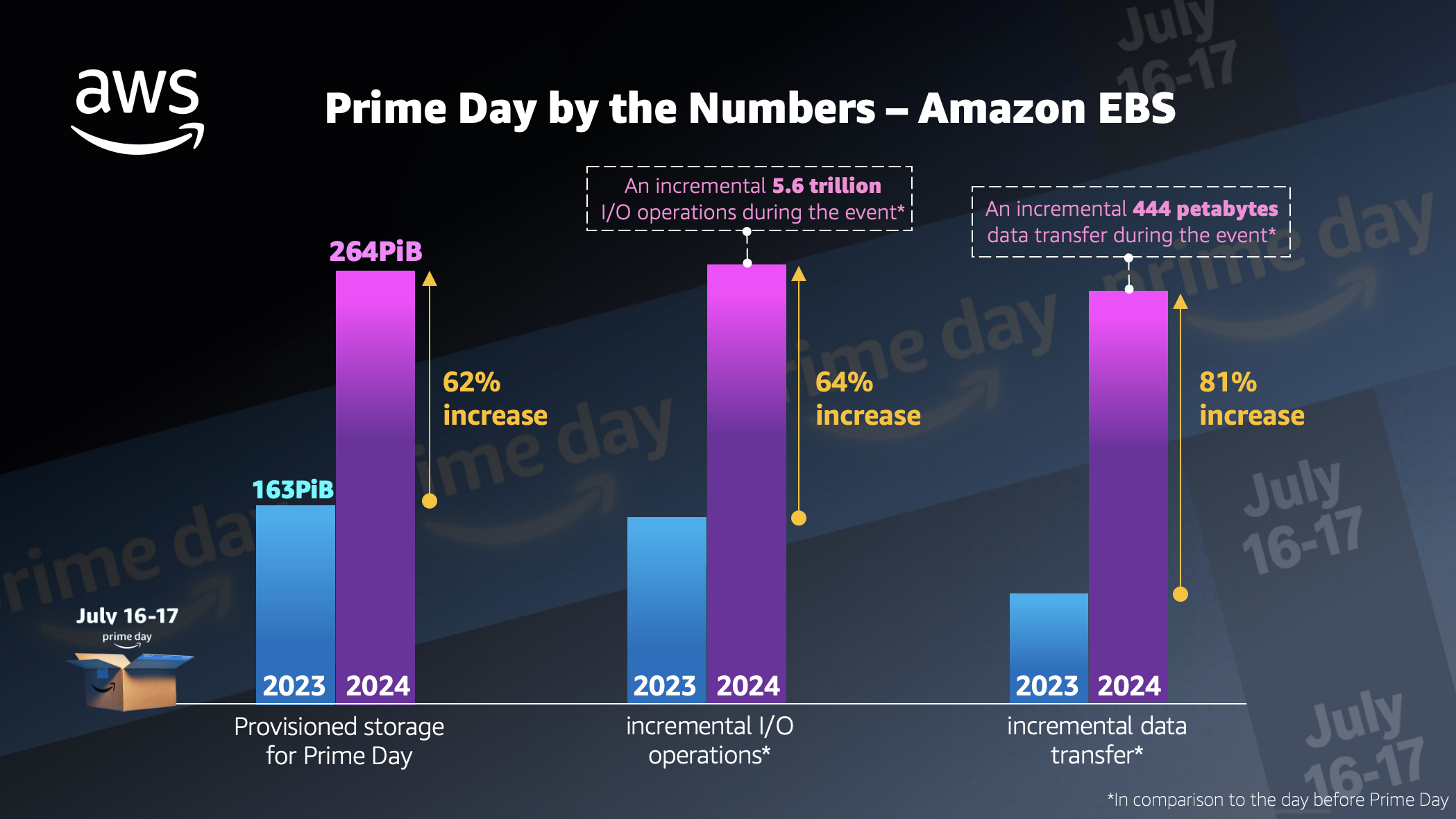 Amazon EBS – In support of Prime Day, Amazon provisioned 264 PiB of Amazon EBS storage in 2024, a 62 percent increase compared to 2023. When compared to the day before Prime Day 2024, Amazon.com performance on Amazon EBS jumped by 5.6 trillion read/write I/O operations during the event, or an increase of 64 percent compared to Prime Day 2023. Also, when compared to the day before Prime Day 2024, Amazon.com transferred an incremental 444 petabytes of data during the event, or an increase of 81 percent compared to Prime Day 2023.