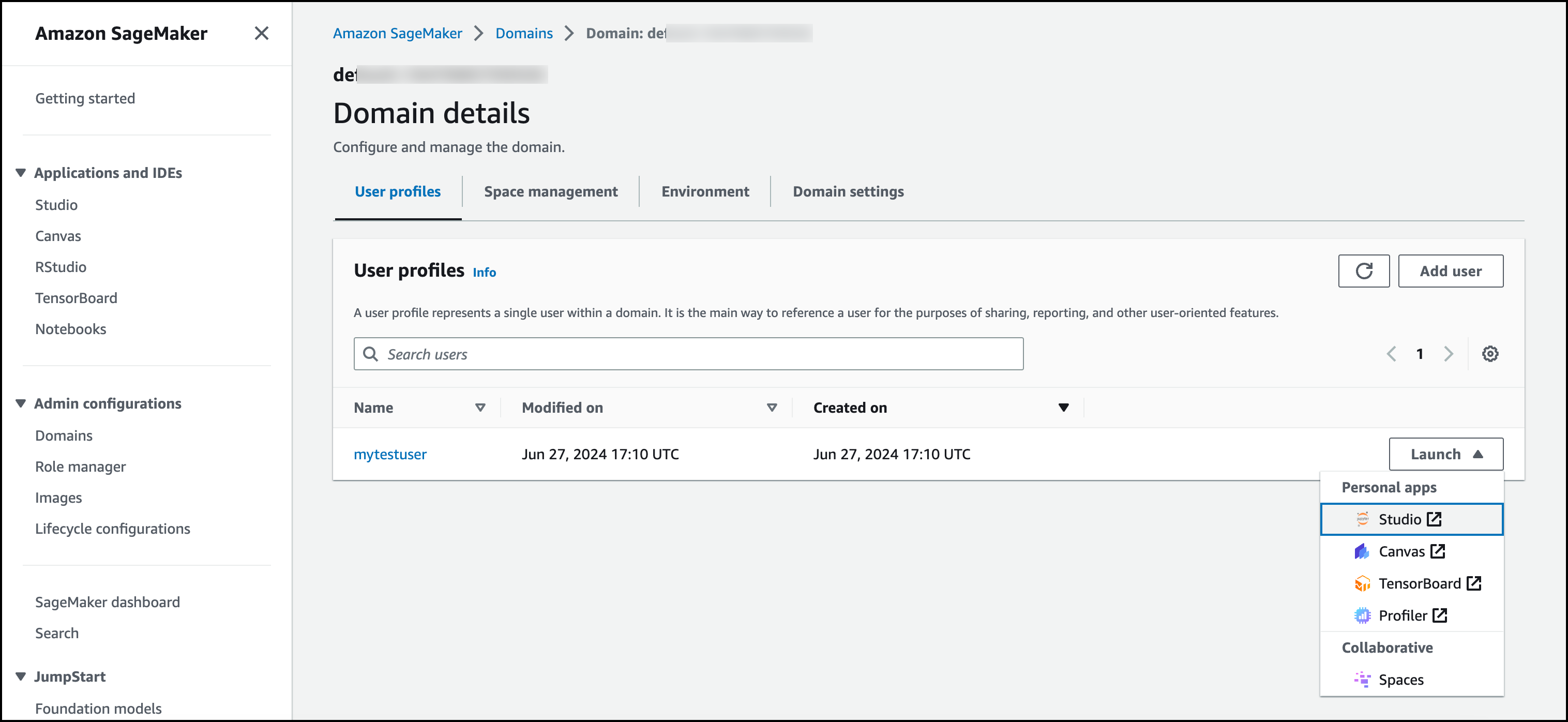 In the Amazon SageMaker console, I go to Domains under Admin configurations and enable Amazon Q Developer under domain settings. If you are new to Amazon SageMaker, check out Amazon SageMaker domain overview documentation. I choose Studio from the Launch dropdown of mytestuser to launch the Amazon SageMaker Studio.