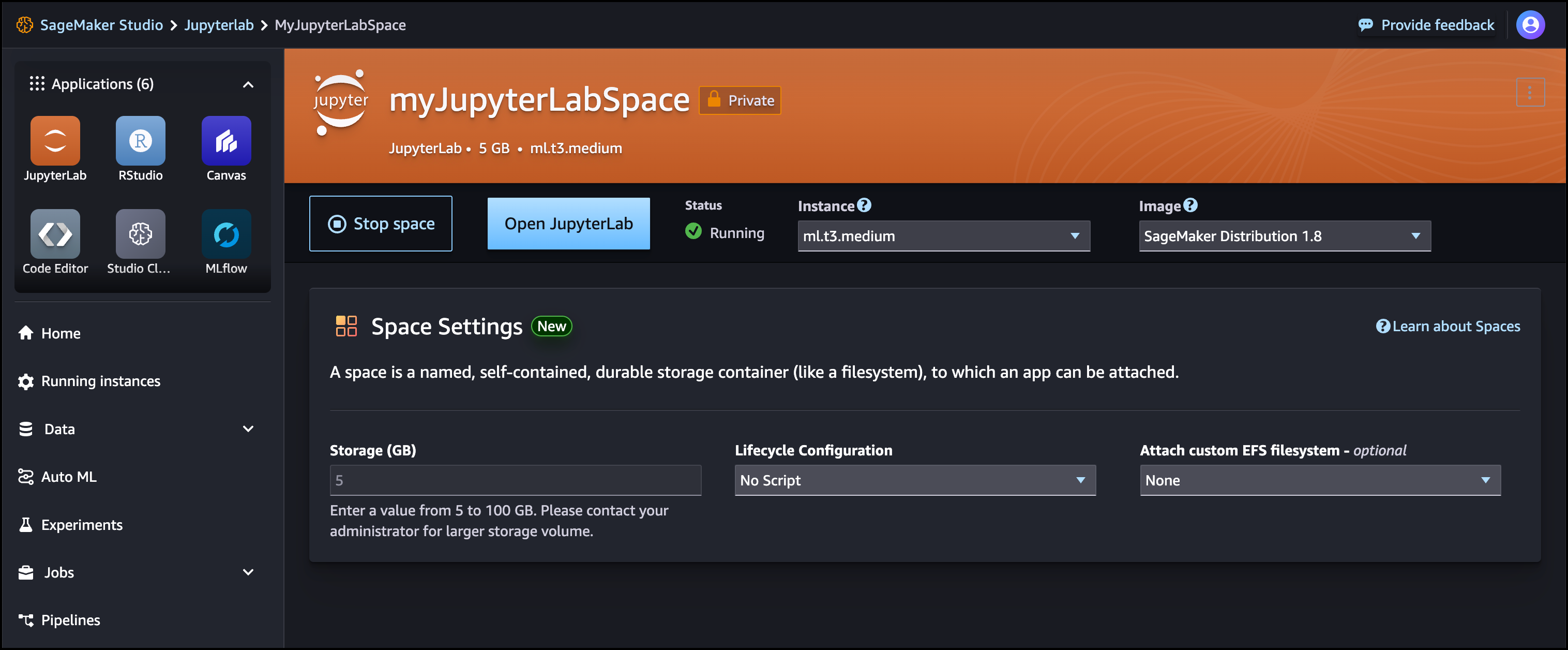When my environment is ready, I choose JupyterLab under Applications and then choose Open JupyterLab to open up my Jupyter notebook.