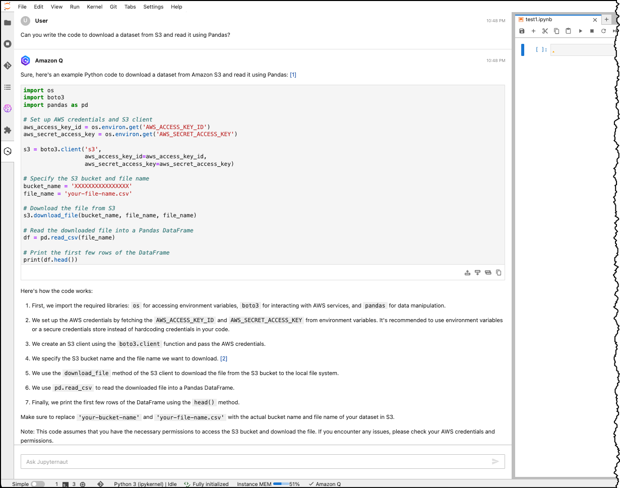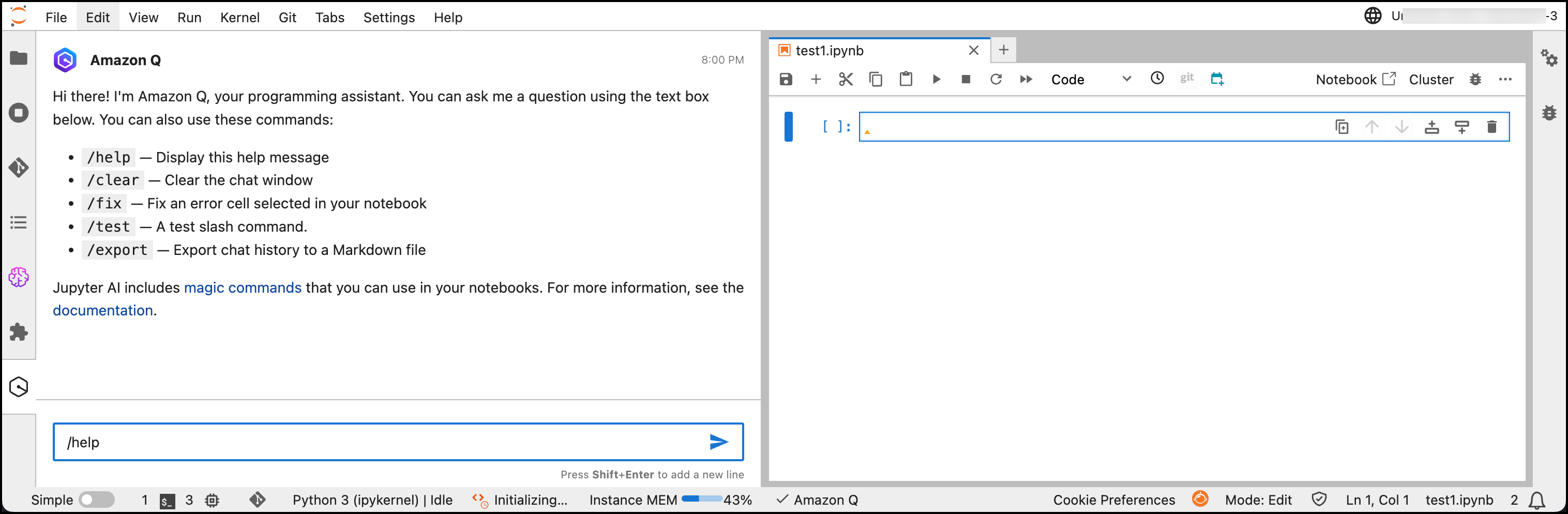 The generative AI–powered assistant Amazon Q Developer is next to my Jupyter notebook. There are built-in commands that I can now use to get started.