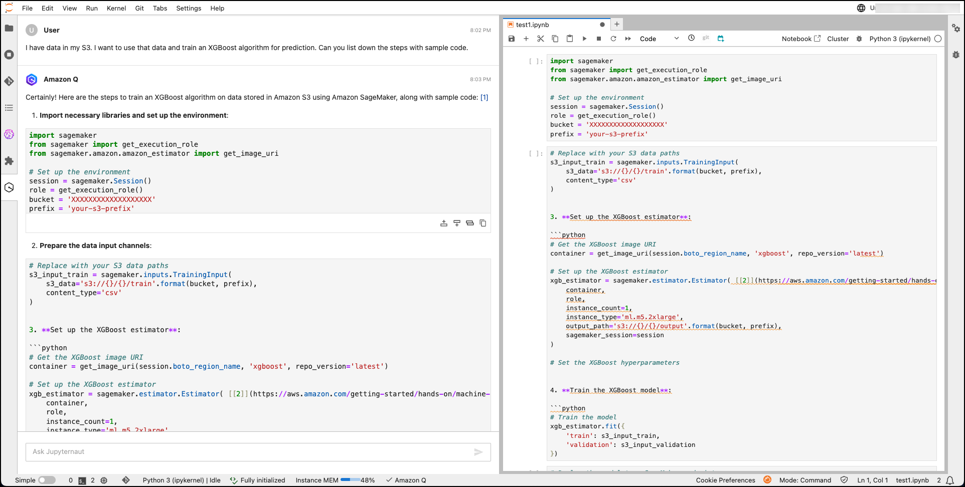 Amazon Q Developer provides me step-by-step guidance and generates code for training an XGBoost algorithm for prediction. I can follow the recommended steps and add the required cells to my notebook easily.
