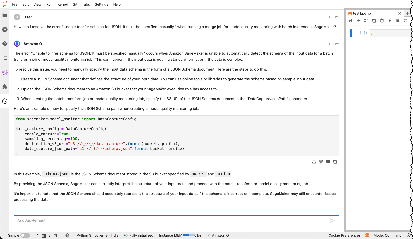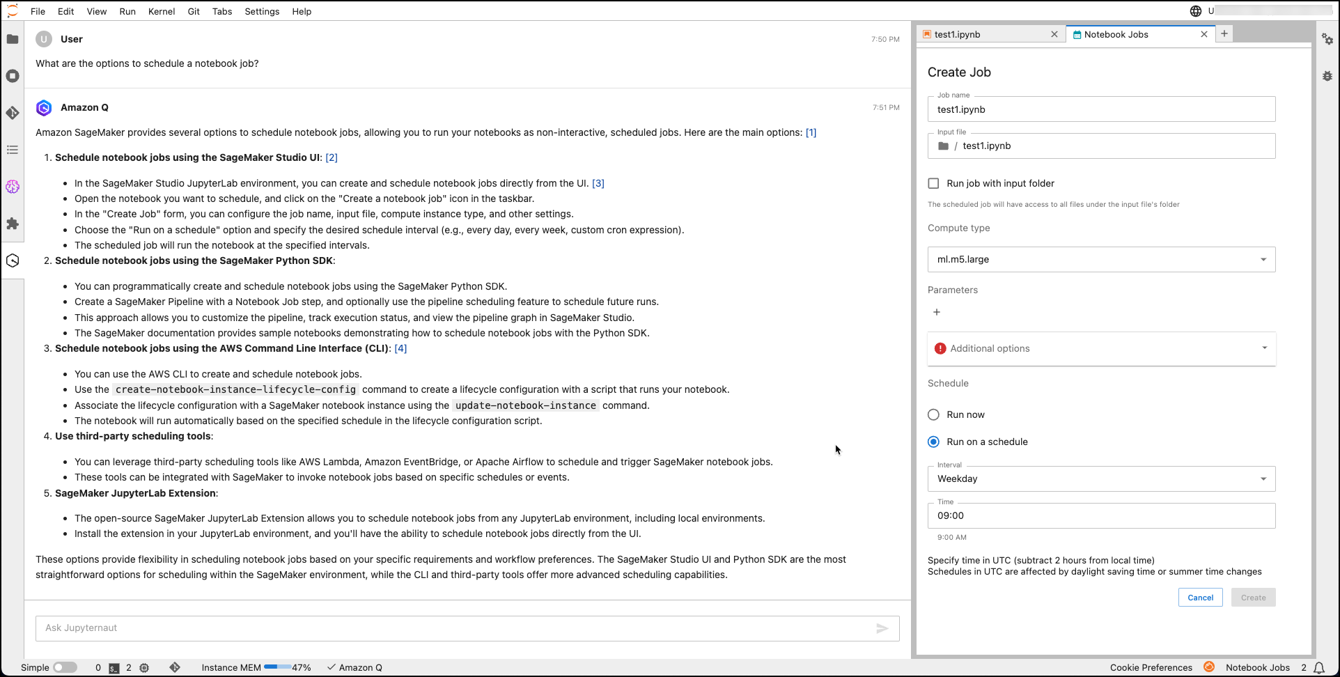 As a final example, I ask Amazon Q Developer to provide me recommendations on how to schedule a notebook job. I use the following prompt to get the answer: