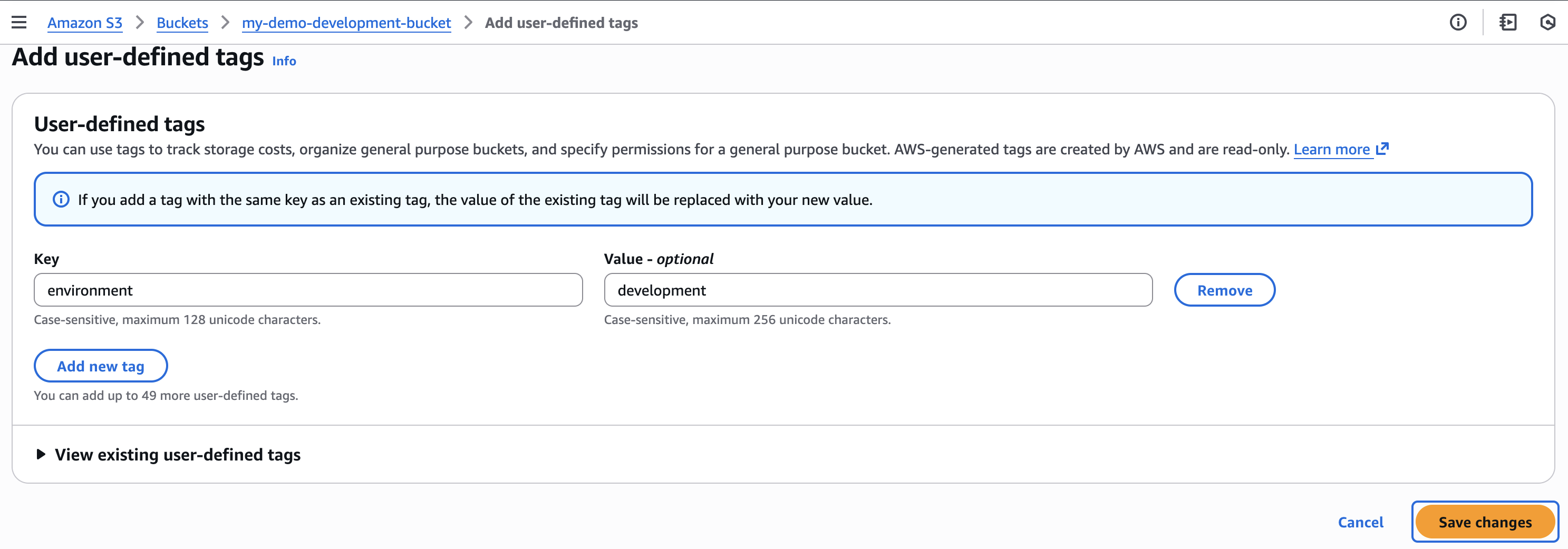 Next, let’s tag our S3 general purpose bucket. I add an environment:development tag which will become the criteria for my tag-based authorization.