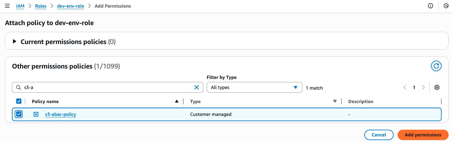 Now that my S3 bucket is tagged, I’ll create an ABAC policy that verifies matching environment:development tags and attach it to an IAM role called dev-env-role. By managing developer access to this role, I can control permissions to all development environment buckets in a single place.