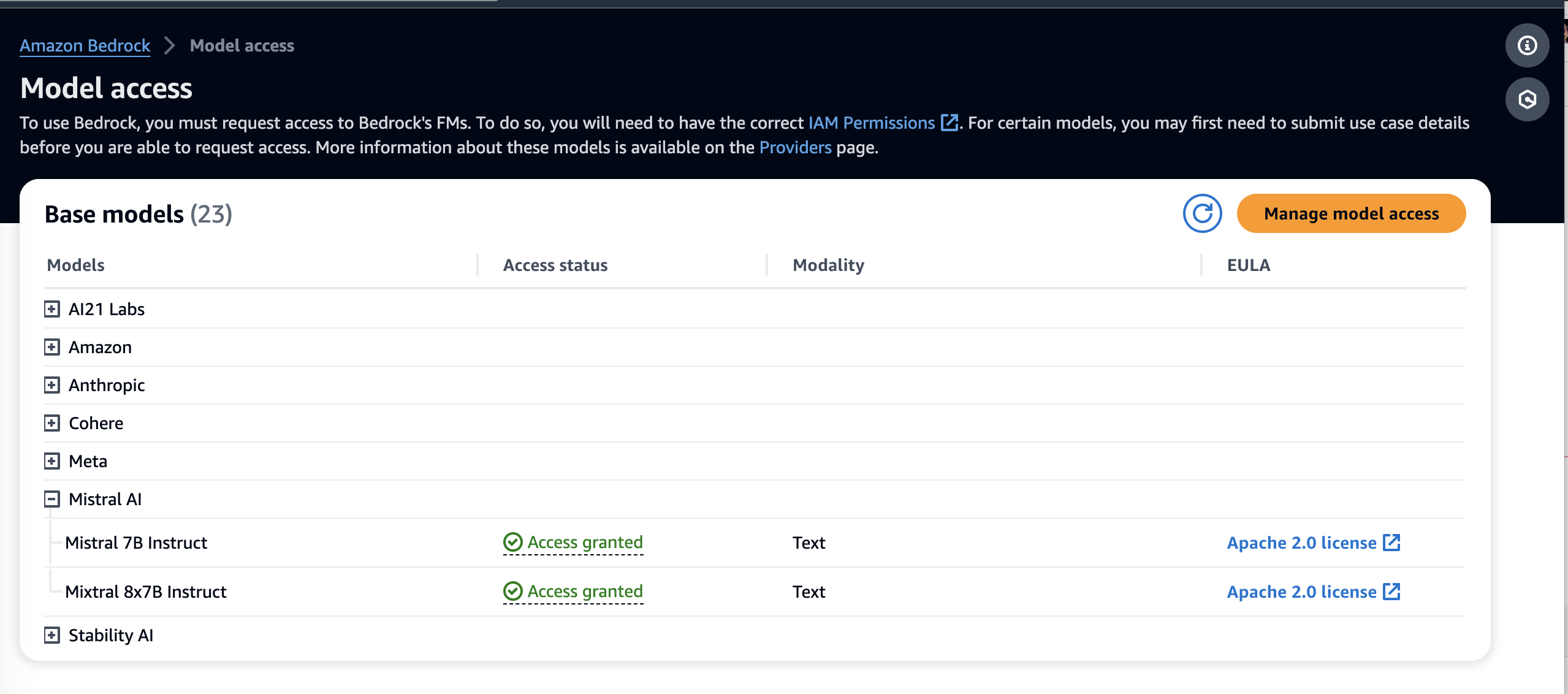To get started with Mistral AI models in Amazon Bedrock, first you need to get access to the models. On the Amazon Bedrock console, select Model access, and then select Manage model access. Next, select Mistral AI models, and then select Request model access.